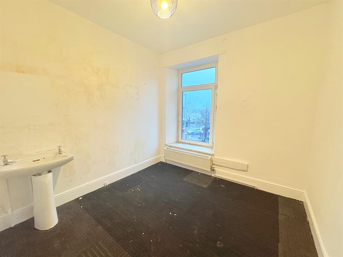 White door upon entry, fitted sink, grey carpets, white walls, white radiator,one window overlooking front of the property, various plug sockets.