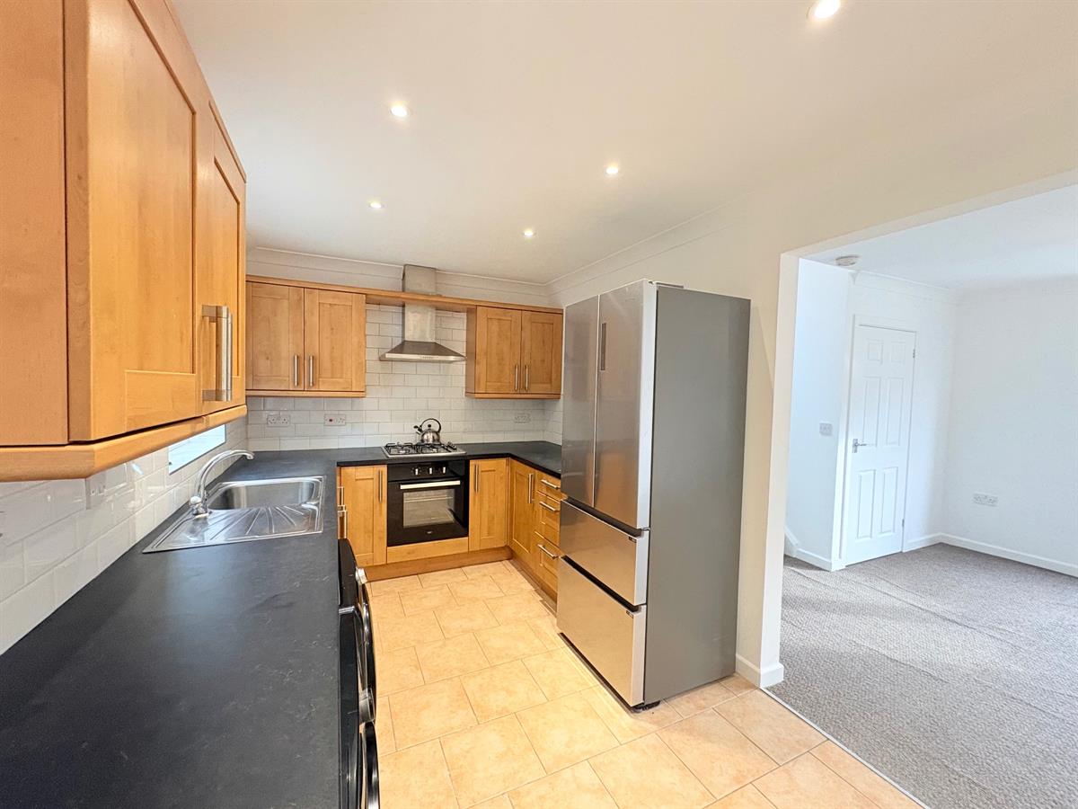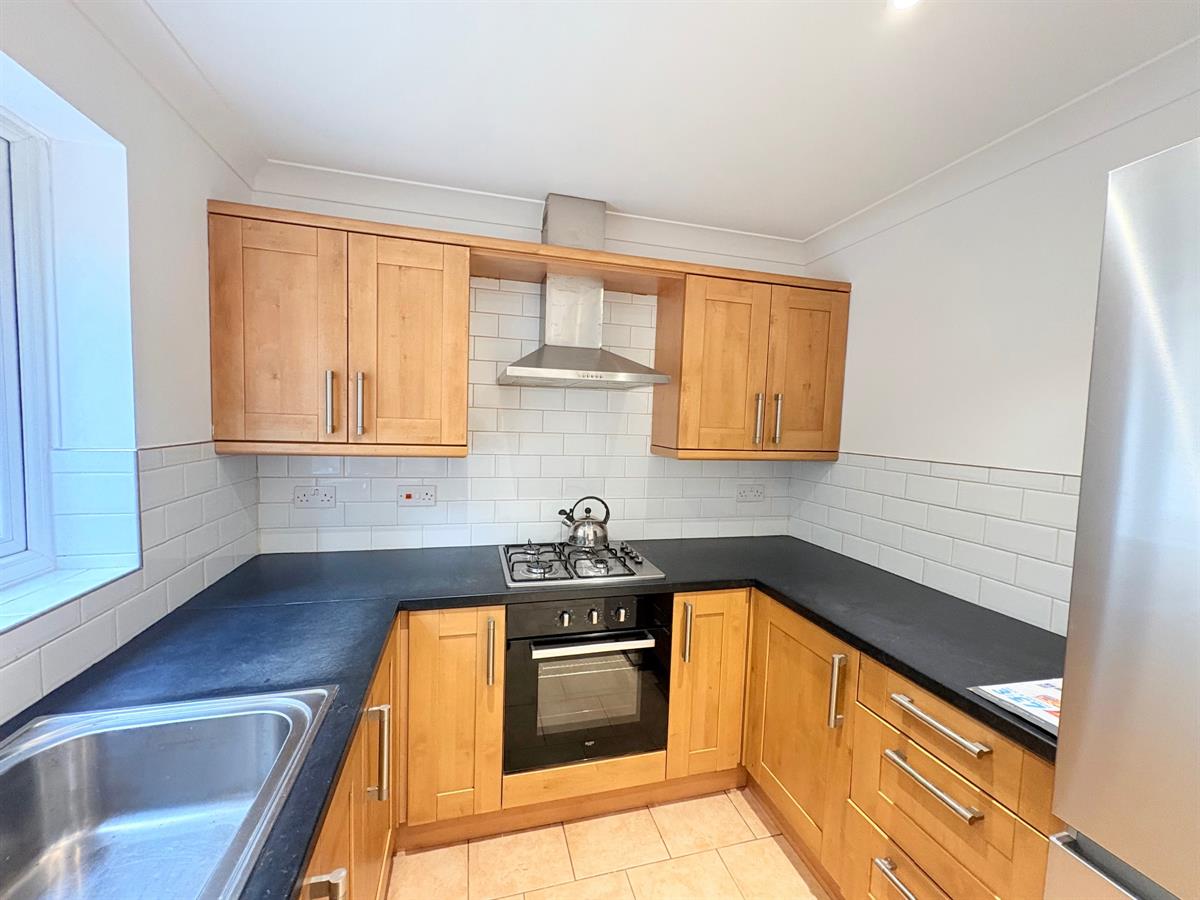Open entry from living room, beige tiled flooring, white skirting boards, white walls, one white radiator, four dual plug sockets, wood kitchen cabinets, black worktops, silver sink, one window overlooking rear, dual doors leading to exterior.