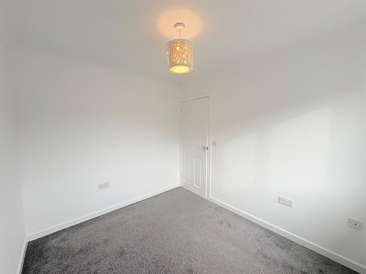 White door with silver handle upon entry, grey carpets, white skirting boards, white walls, three dual plug sockets, one white radiator, one window overlooking rear.