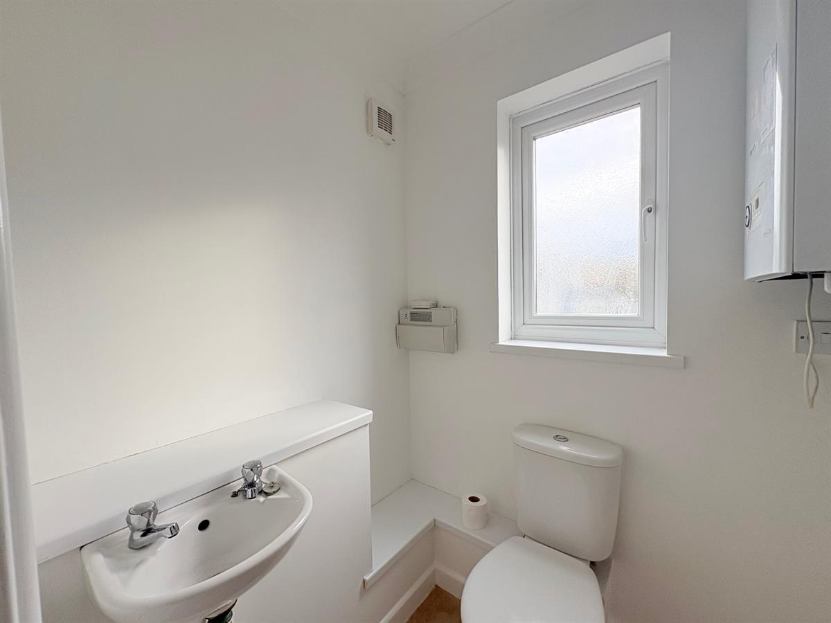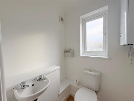 White door with silver handle upon entry, beige tiled flooring, white skirting boards, white walls, white sink with silver taps, white toilet, one frosted window overlooking front, boiler and fusebox located here.