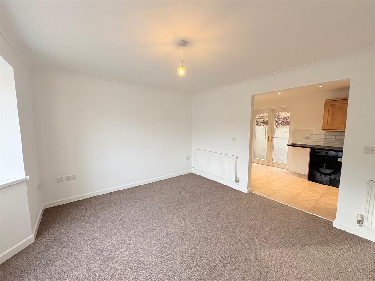 White door with silver handle upon entry, brown carpet, white skirting boards, white walls, two white radiators, bay window overlooking front, four dual plug sockets, stairway leading to first floor, open plan to kitchen.