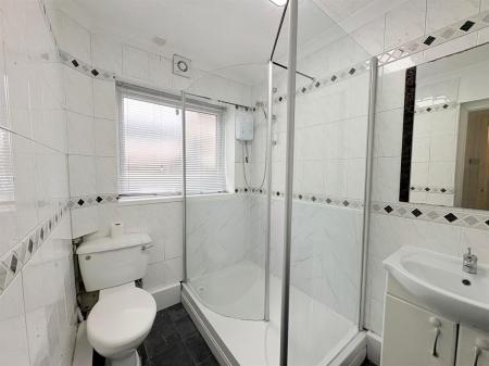 White door with gold handle upon entry, black tiled flooring, white skirting boards, white tiled walls, one black radiator, white sink with silver taps, white toilet, white shower with clear glass surrounding, extractor fan fitted, one frosted window overlooking rear.
