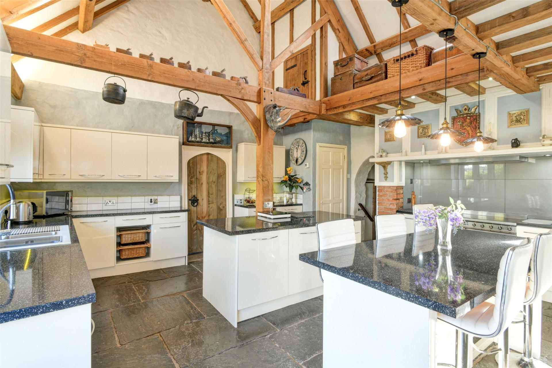 The galleried main reception room befits a property with 16th century medieval origins and provides a stunning living space nearly 50 feet long and 19 feet wide. Flooded by natural light from the large oak panelled glass doors and windows to both the front and rear aspect. Underfloor heating plus radiators and a wood burner ensure the room offers a cosy feel.