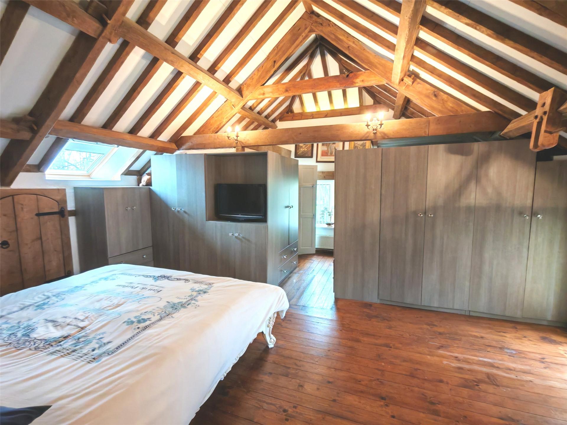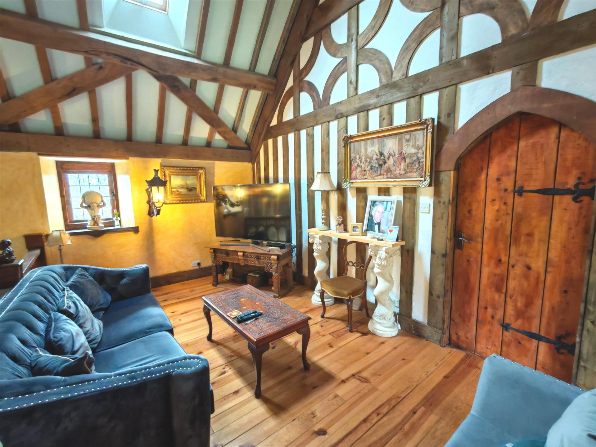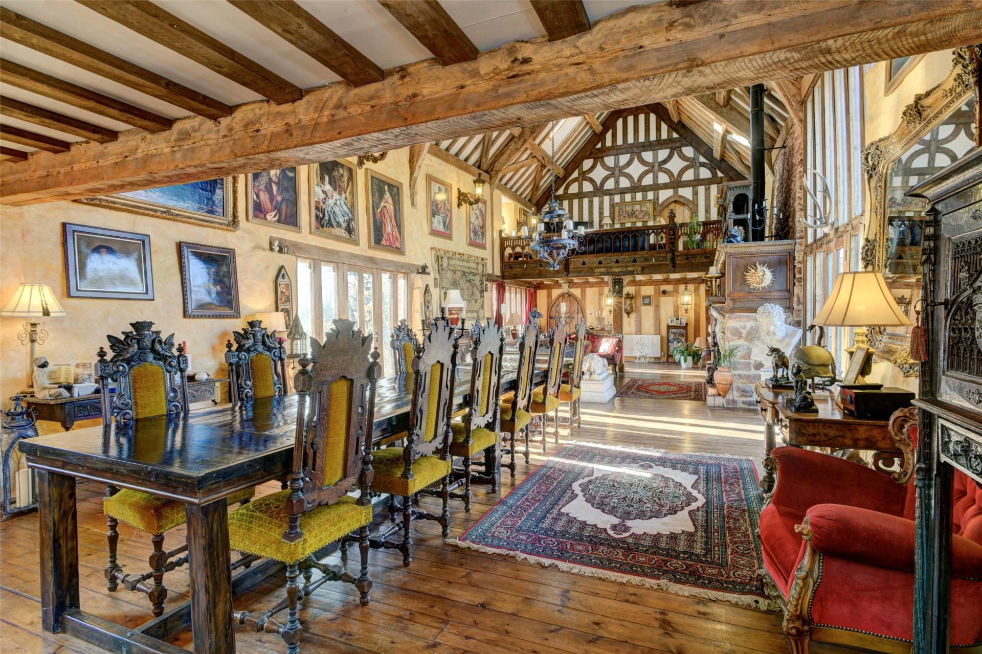 At one end a hidden stair case leads to a first-floor double bedroom with en-suite bathroom and further additional living area on the second floor overlooking the main reception hall.