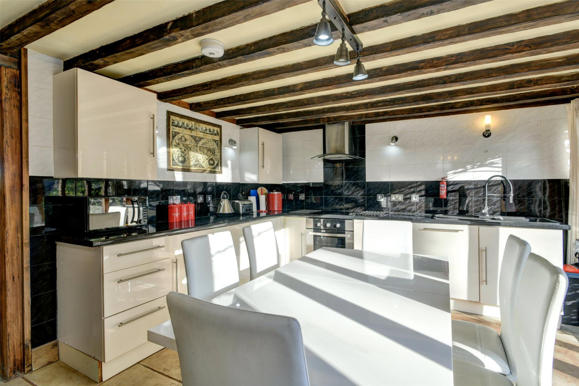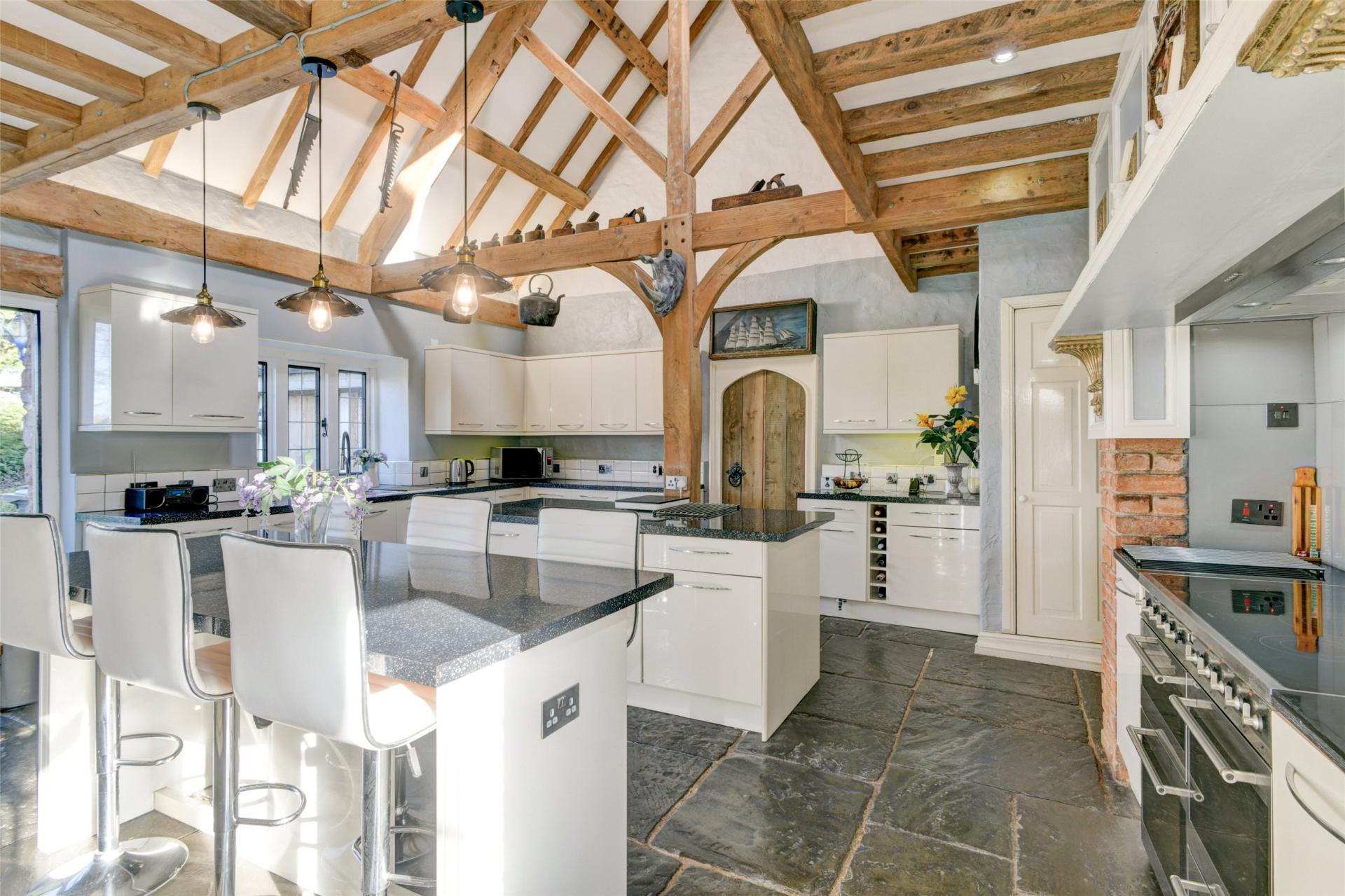 The kitchen/breakfast room is a delightful space with vaulted ceiling and exposed beams combined with extensive range of modern units and fitted appliances. A breakfast bar enjoys the benefit of views to both the front and rear gardens through doors and windows to both aspects.