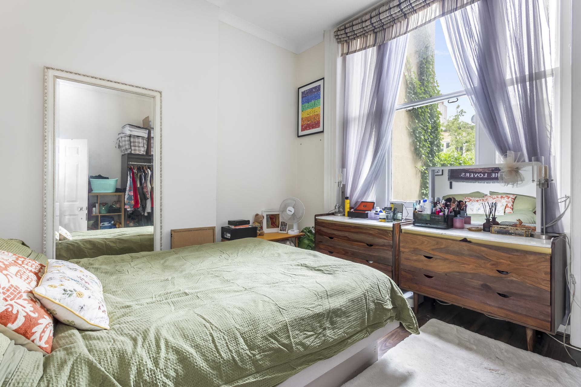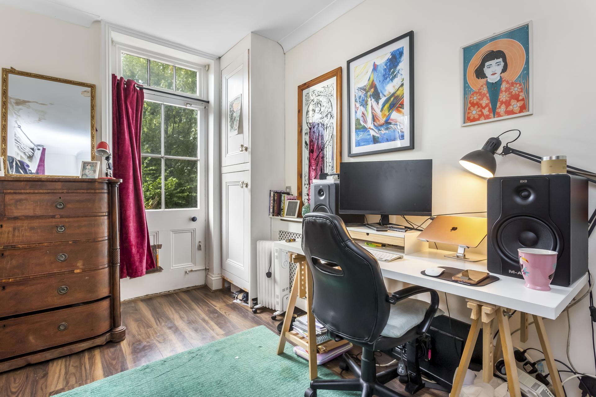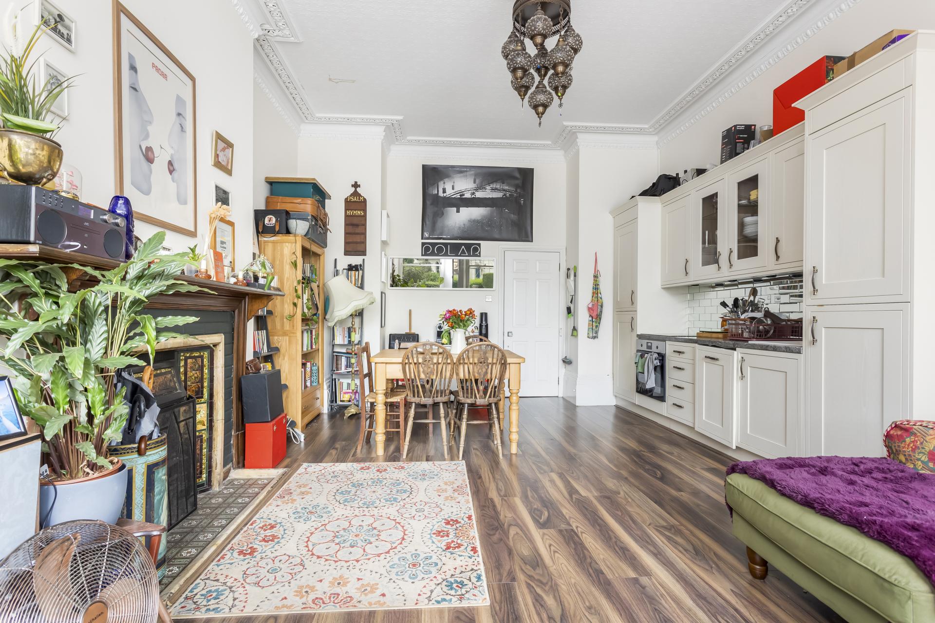 Set on the raised ground floor of a charming period building, the property benefits from a large open plan lounge and modern kitchen, two double bedrooms and a contemporary bathroom suite with an enviable roll-top bathtub. This apartment has its own private west facing patio garden, a stunning selection of period features including high ceilings, a fireplace, decorative cornicing, a intricate ceiling rose and large sash windows. There property also offers a good amount of in-built storage.