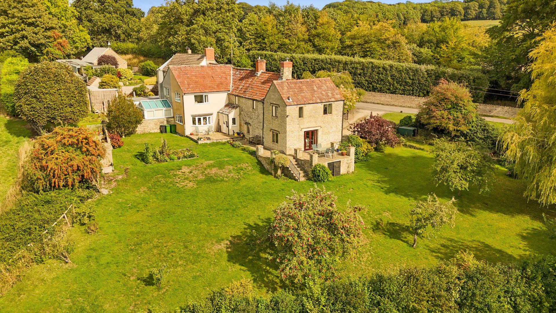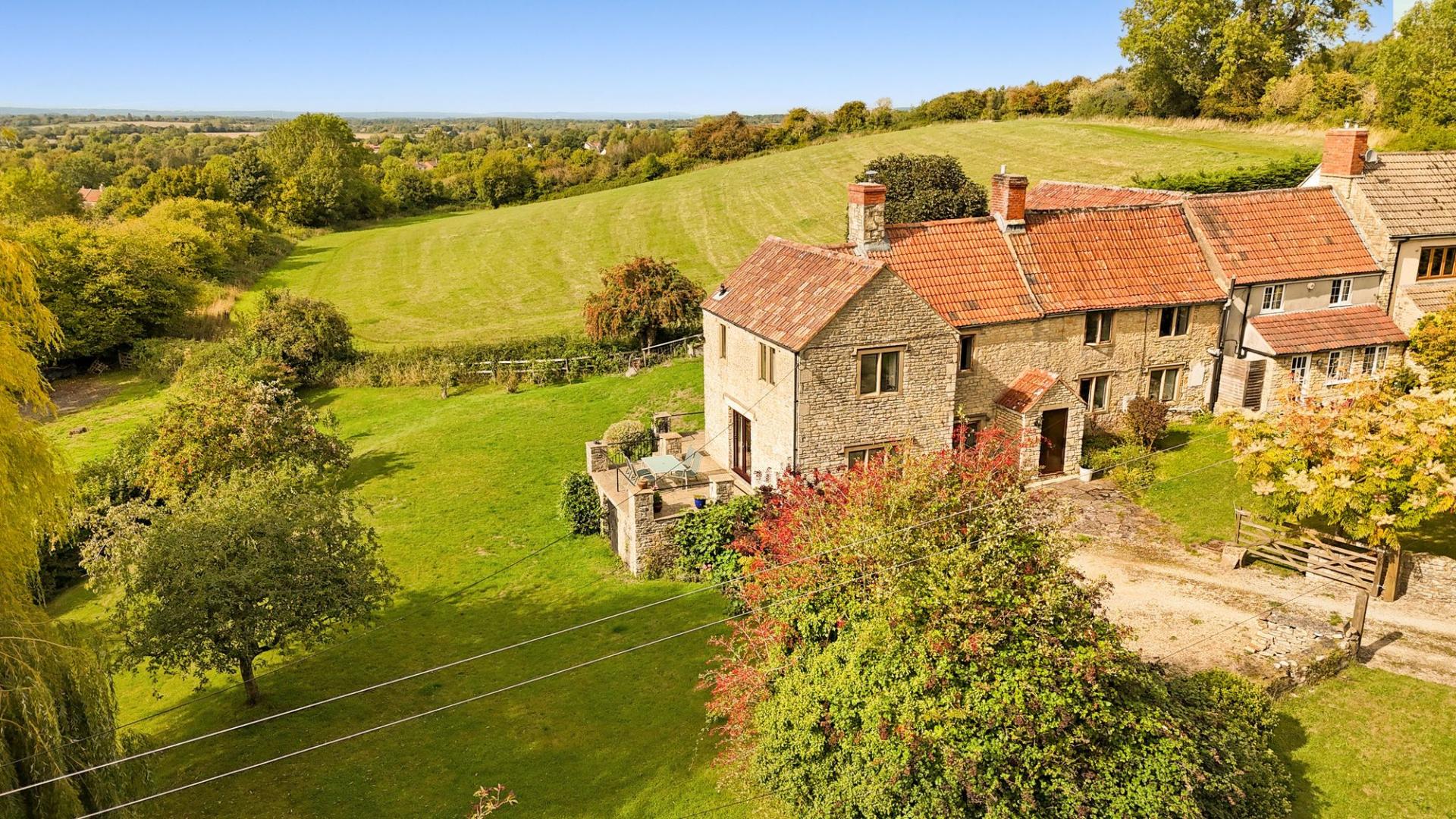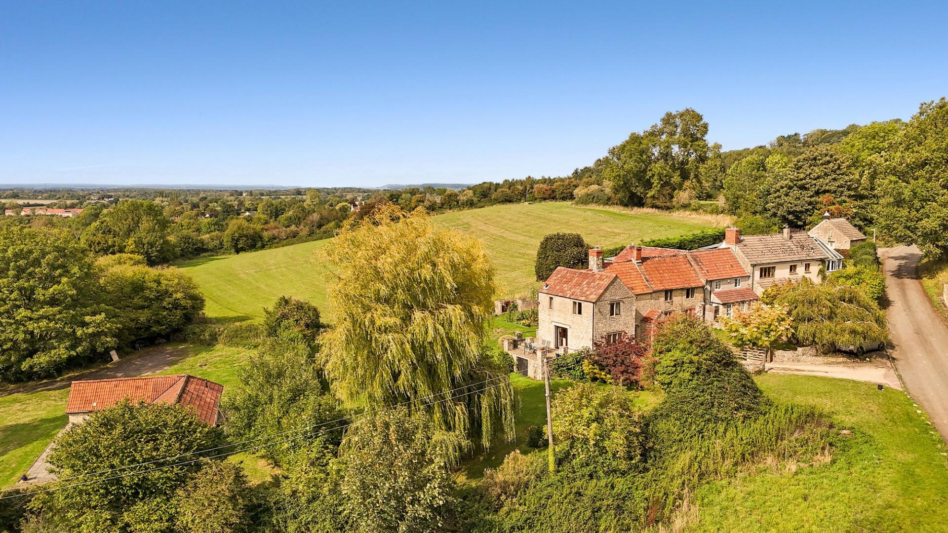 "Unique country home on 10-acre plot with stables and paddocks. Breathtaking views towards Lansdown. Split-level house w...