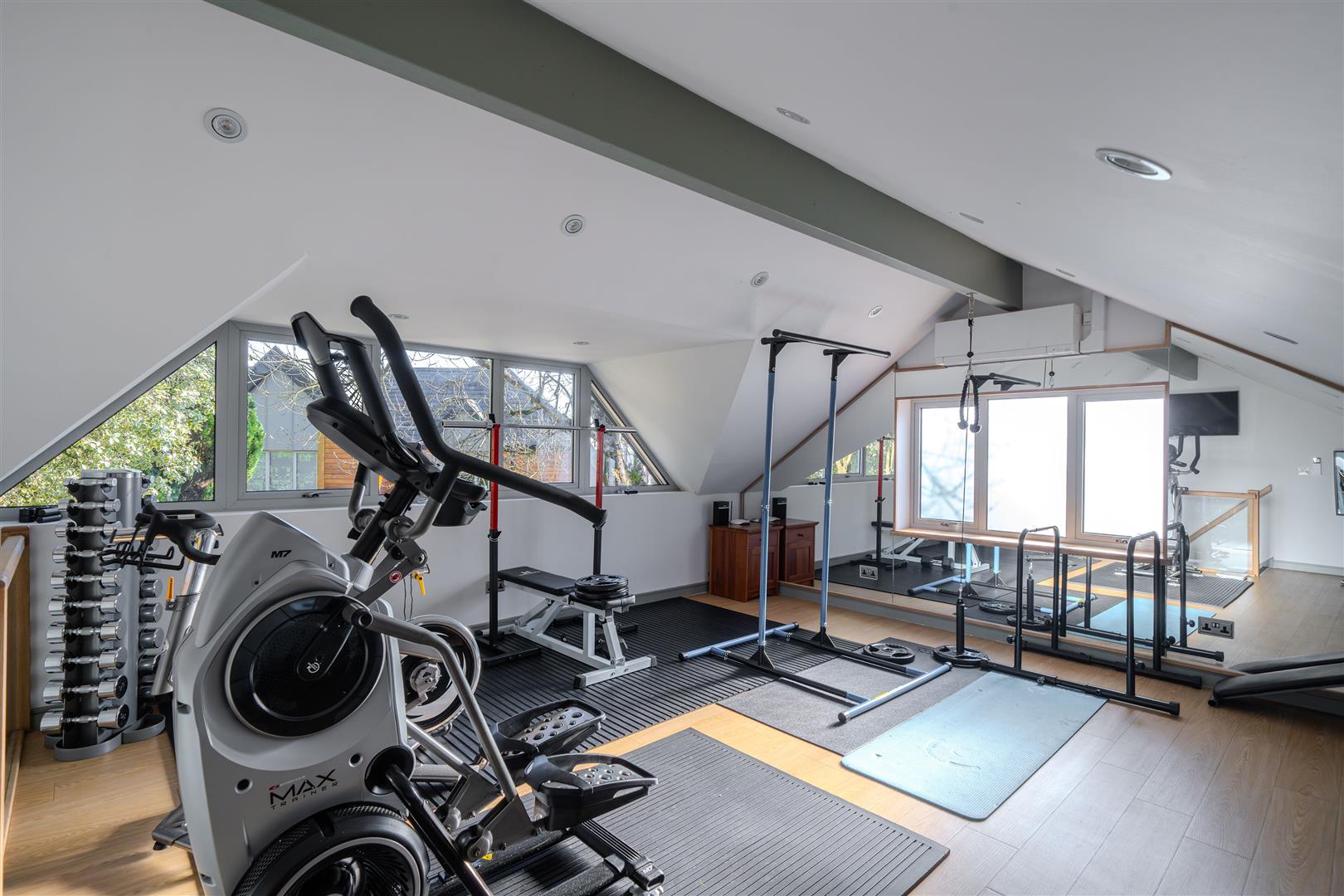 Outside, a detached garage offers good-sized accommodation above that is presently used as a gymnasium. However, this could be easily adapted to provide ancillary accommodation or office space, as desired. The garaging is approached across a spacious, stone and resin finished driveway that gives an unusual amount of visitors' car parking space and is approached through automated entrance gates with intercom. The easily accessible, level garden provides pleasant, private entertainment space and has uninterrupted exposure to the southerly sunshine, with an expanse of open sky, accentuated by the elevation of the site.