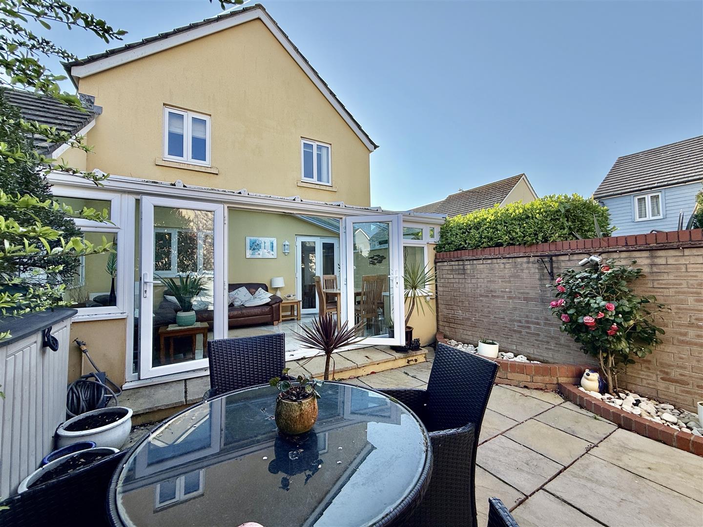 Outside, the property features an attractive, low-maintenance frontage with established planting. There is private parking ahead of a large attached garage, which also has integral access from the garden room. The rear garden is a real feature-sunny, private, and beautifully landscaped to create a peaceful retreat, with plenty of space for outdoor dining and bordered by mature, colourful shrubs.