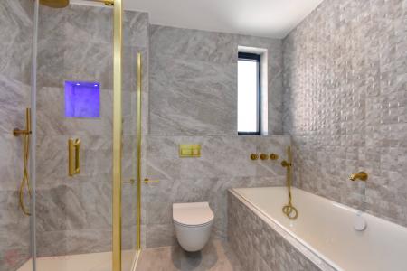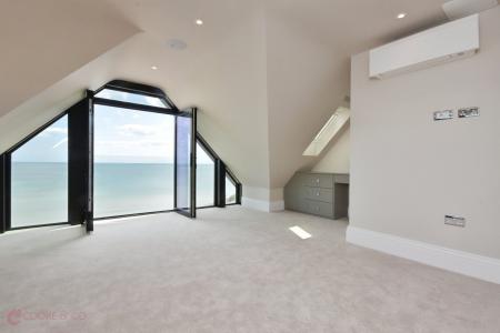 The master bedroom offers a true sanctuary, with an en-suite, walk-in wardrobe, Juliet balcony with beautiful sea views, and air conditioning. The further bedrooms are equally luxurious, with two doubles boasting en-suites and private balconies, one of which is front-facing with spectacular views, complemented by an inviting stand-alone bath.