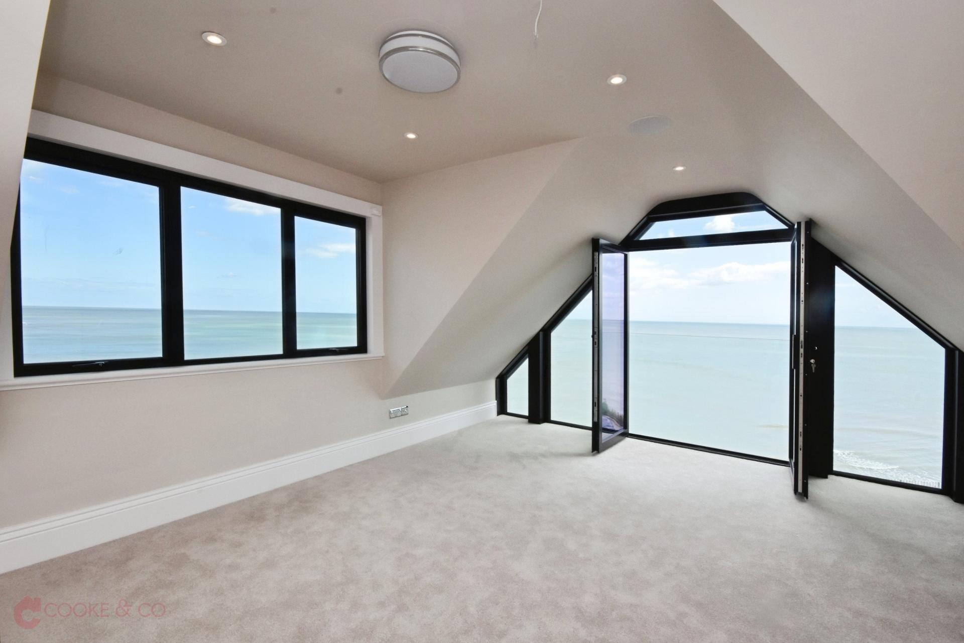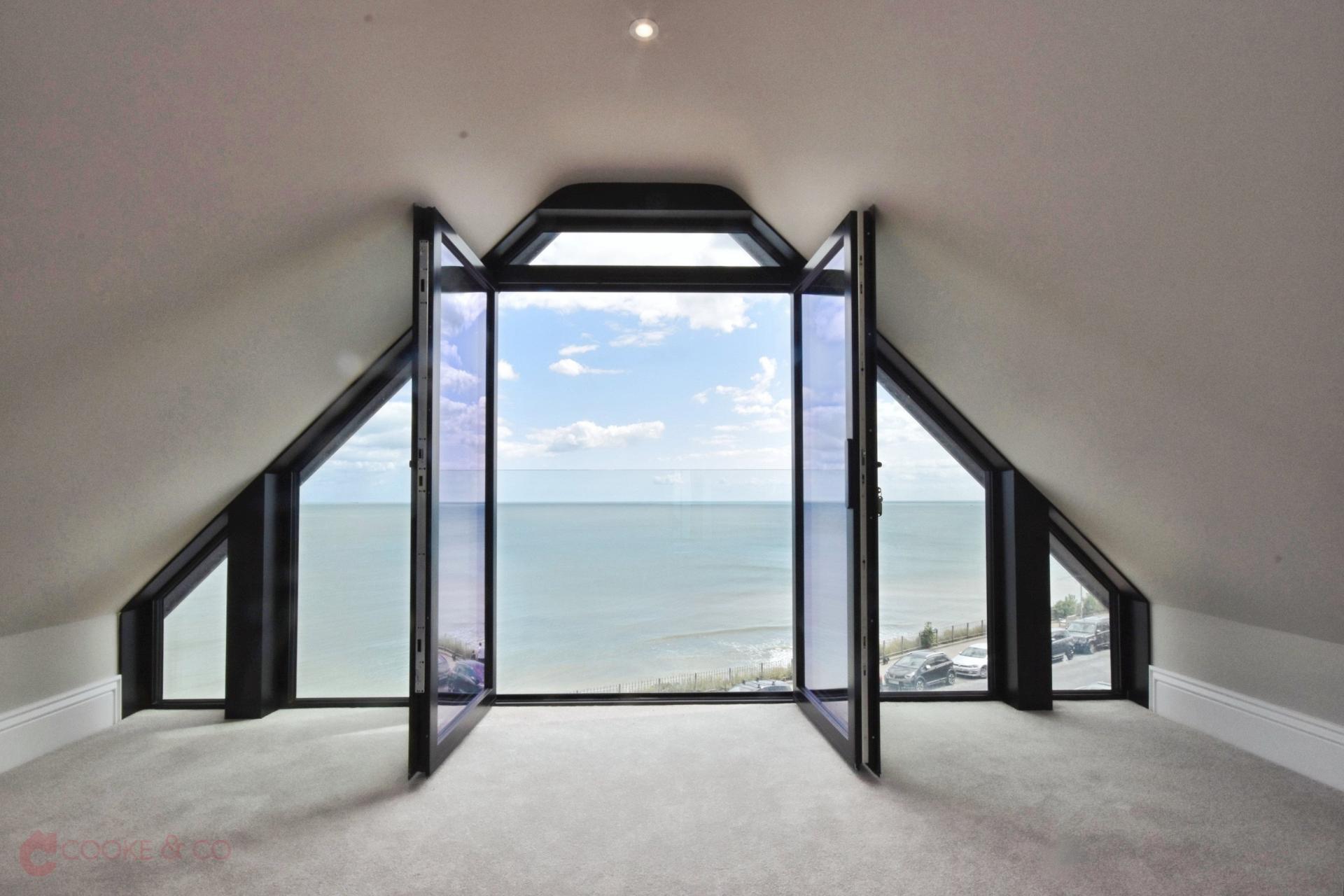 Relax in the two spacious reception rooms: one featuring a cosy fireplace and bi-fold doors leading to a front terrace with direct sea views, perfect for enjoying the sights and sounds of the coast. The second reception room opens directly to the two-tier garden, one level is paved, ideal for entertaining, while the raised lawn section offers fantastic sea vistas.