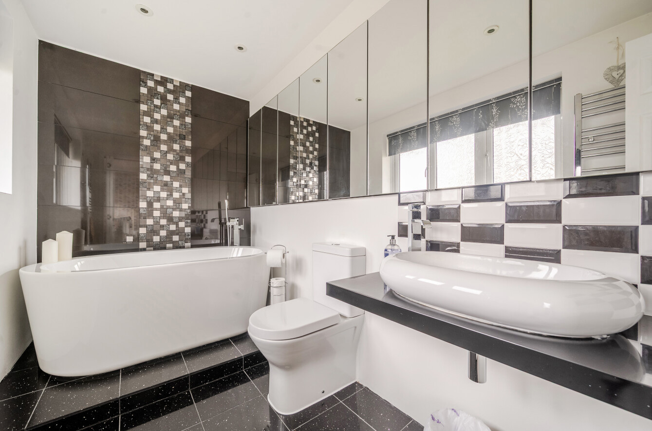 There are three double bedrooms, each with fitted wardrobes. The main bedroom has an en suite bathroom complete with a freestanding oval double ended bath on a raised platform along with a wash hand basin and WC. One wall is part mirrored, while the remaining walls are partially tiled, with tiling extending across the floor. An external window allows for natural light and ventilation