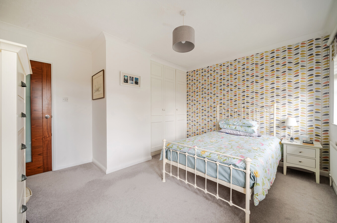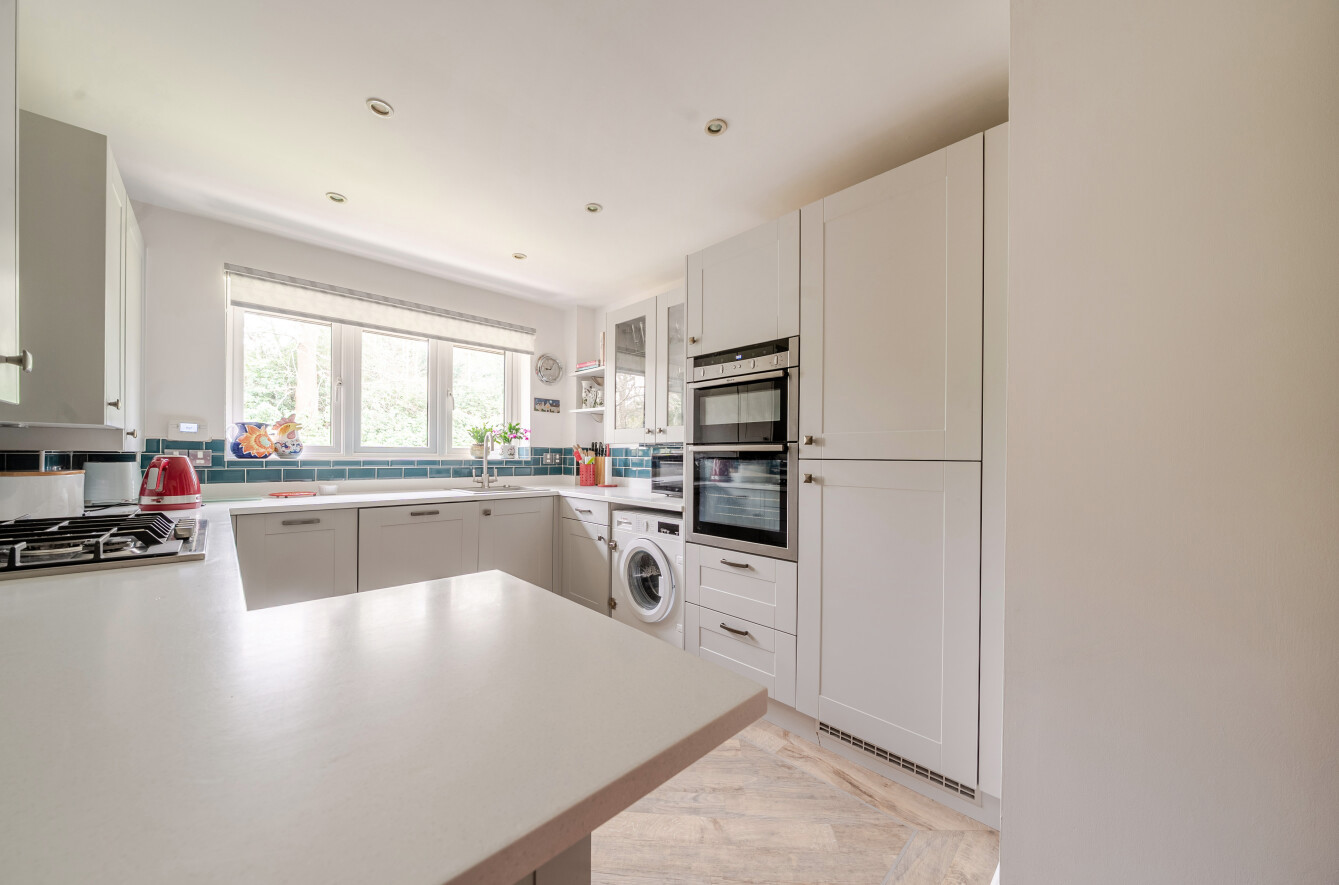 The attractive kitchen is fitted with white Shaker style wall and floor units from John Lewis complemented by Kardean flooring and has a range of integrated appliances. A contrasting tiled splashback adds colour while a breakfast bar provides an ideal space for casual dining.