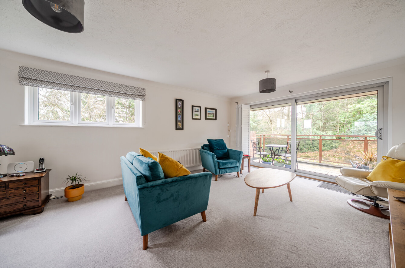 The impressive triple aspect main reception room extends to 31 ft 6 in allowing plenty of room for both comfy sofas and armchairs, as well as a dining table and chairs. The wall mounted TV is to remain. A wall of sliding doors with internal shutters to help keep the room cool in Summer and warm in Winter opens to a large, partially covered private balcony where you can sit and enjoy a view of the attractive grounds.