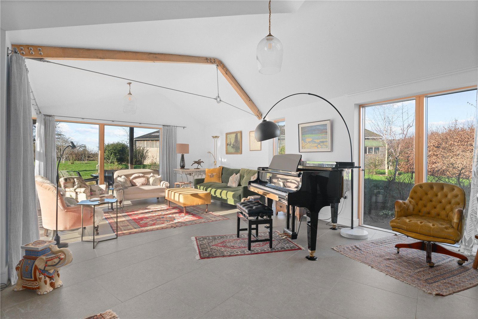 Flowing naturally from the main living area is a snug, where an eco-compliant wood-burning stove introduces warmth and character — perfect for cosy evenings and relaxed weekends.
