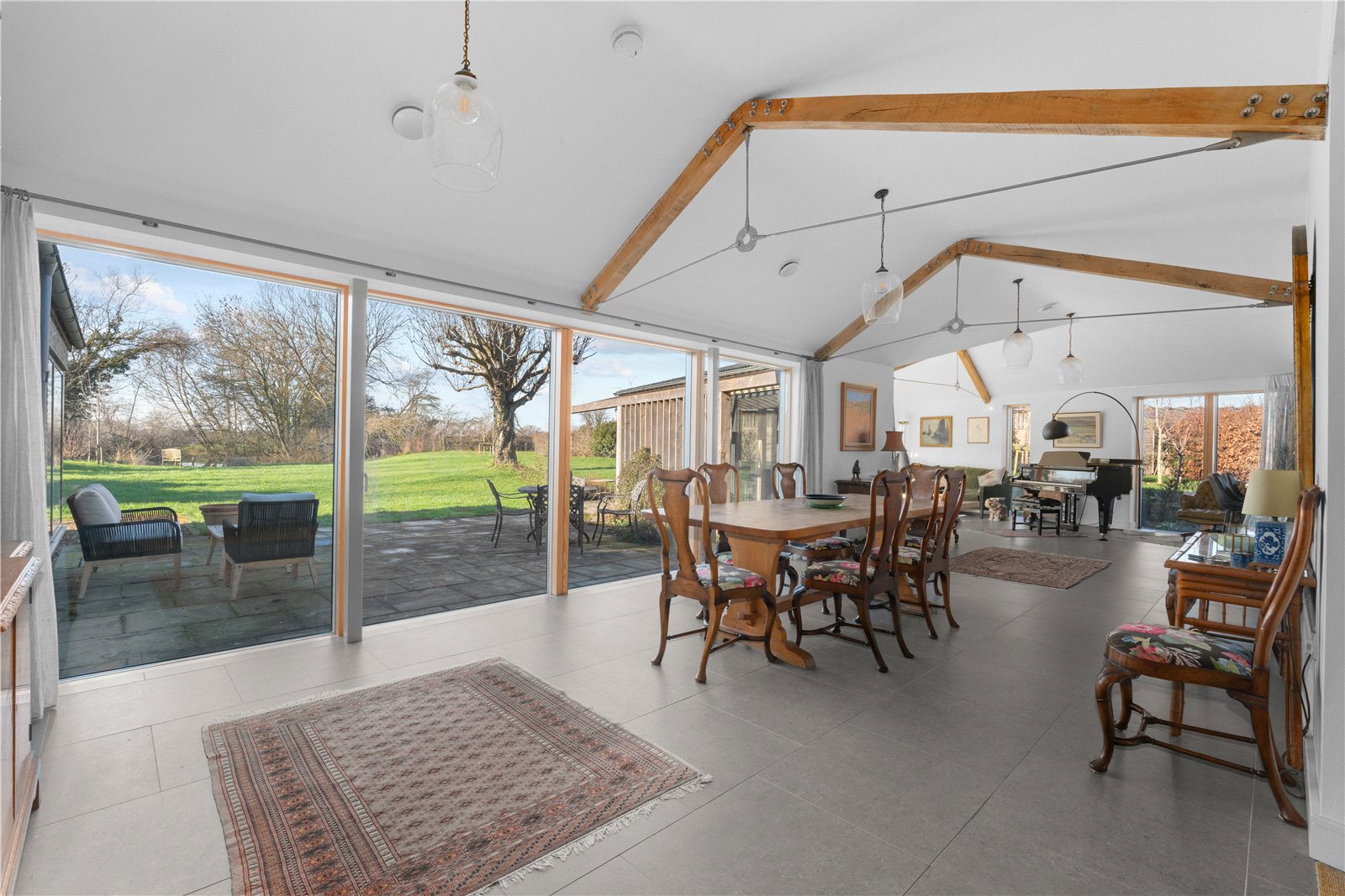 Superb sliding doors stretch across the rear elevation, drawing natural light deep into the space and opening directly onto the garden. In warmer months, inside and out become one fluid entertaining space; in cooler seasons, the expansive glazing frames the landscape beautifully.