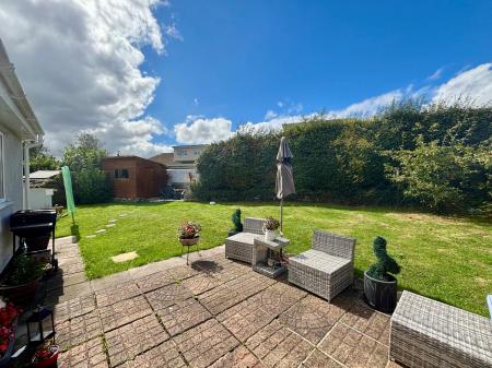 OUTSIDE The spacious and enclosed rear garden offers a fantastic outdoor retreat, featuring paved patio areas ideal for alfresco dining or summer barbecues. A large, level lawn provides ample space for family activities or relaxation, while a garden shed offers convenient storage solutions.
