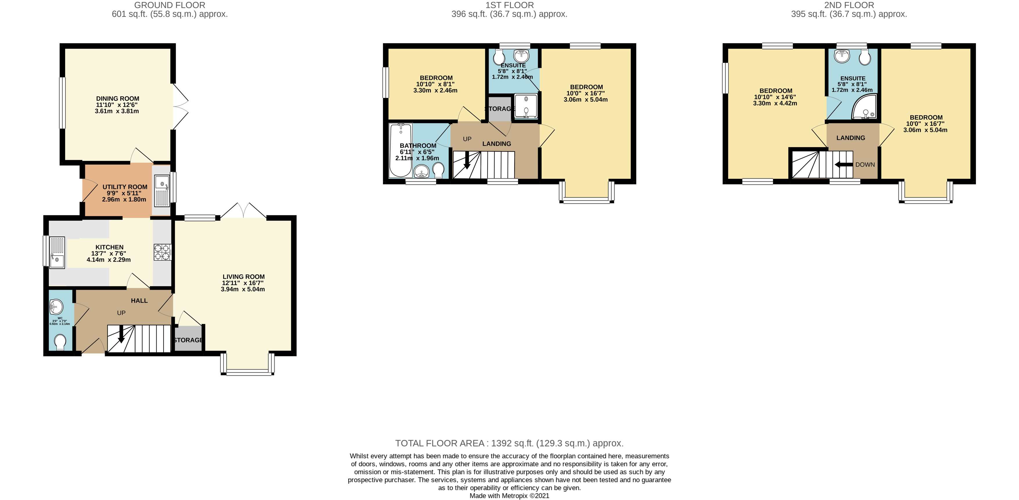 Brief internal accommodation comprises a spacious entrance hallway, guest cloakroom, dual aspect living room with patio doors leading into the garden, fully fitted kitchen, utility room and large dual aspect dining room. To the first floor there is a modern family bathroom, two double bedrooms and an en-suite to the second. To the second floor there are a further two bedrooms and en-suite to the master. Externally the property offers a secluded and private rear garden with plenty of outdoor storage, a driveway and single garage.