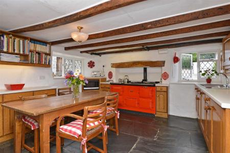 A rear hall leads out to the courtyard and internal doors again lead into both the dining room and drawing room, as well as the kitchen breakfast room and to the sitting room, with further doors to the rear hall and wet room. The Kitchen / breakfast is a dual aspect room with wooden leaded windows overlooking the courtyard, slate flagstone floor, exposed ceiling beams, four oven oil fired Aga, fitted oak wall and base units with roll top worksurfaces, built in dishwasher, and fridge, and recess for a microwave. Doors lead to the panty with slate floor & shelves, fitted units, sink and built-in oven and also to the utility room with fitted cupboards, butler's sink, Miele washing machine and tumble dryer.