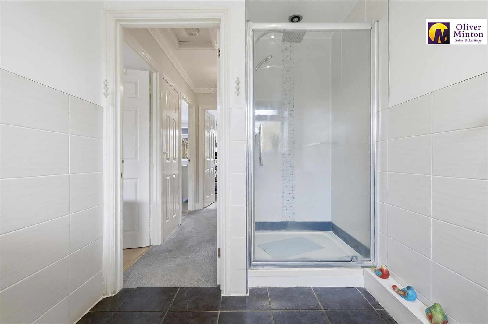 Walk in shower cubicle, vanity wash hand basin, low level wc, part tiled walls, tiled floors, radiator, obscure window to rear.