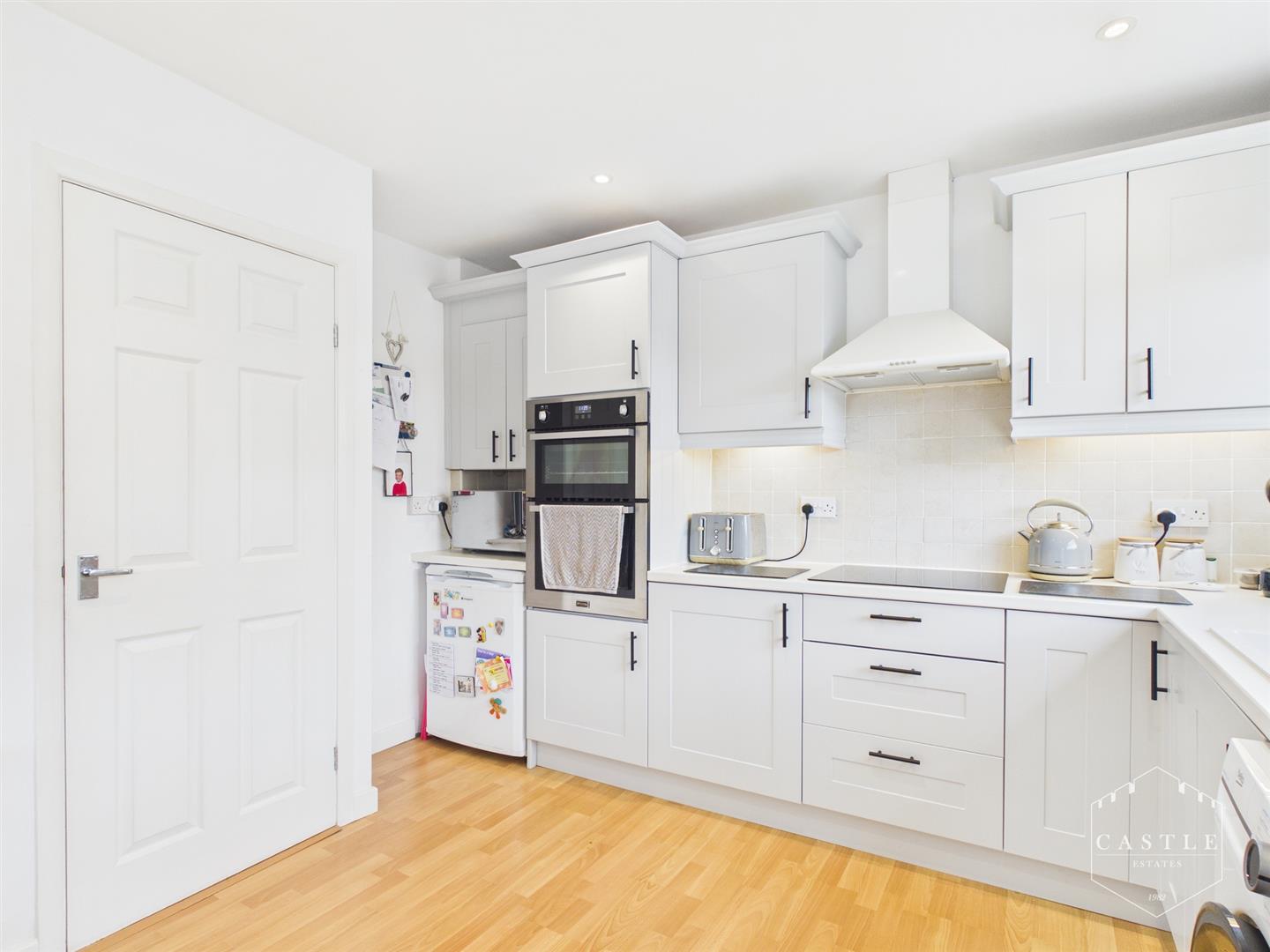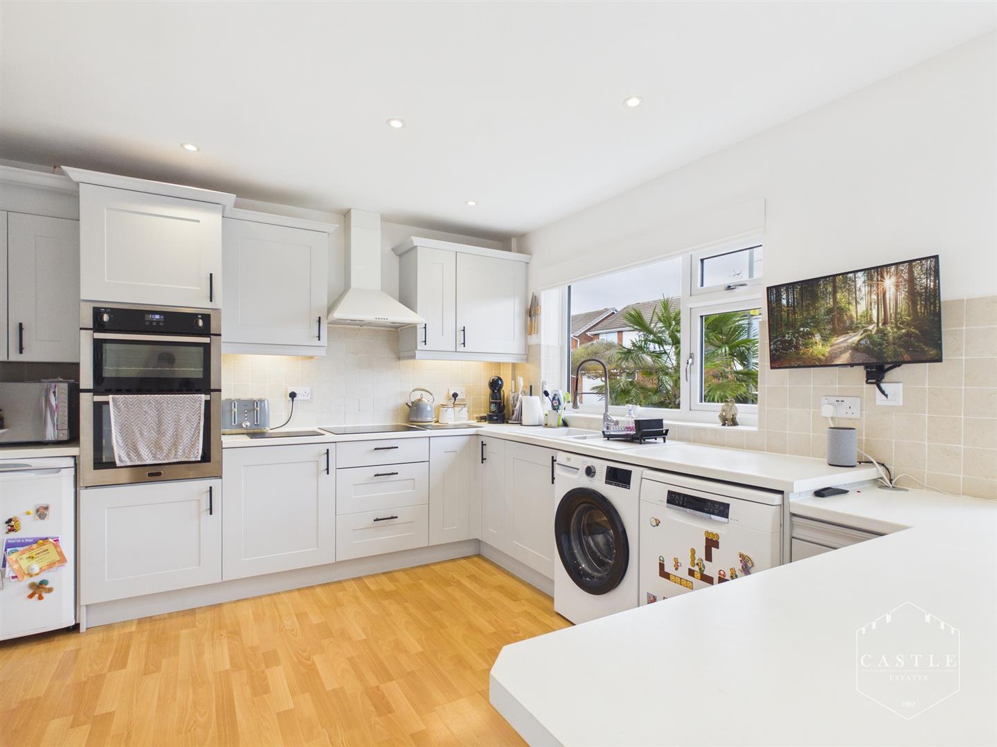Dining Kitchen - 5.74m x 2.97m (18'10 x 9'9 ) - having attractive range of fitted units including base units, drawers and wall cupboards with under lighting, matching work surfaces and inset sink with mixer tap, ceramic tiled splashbacks, breakfast bar, built in double oven, ceramic hob with cooker hood over, space and plumbing for washing machine, space for fridge freezer, wood effect flooring, inset LED lighting, tv aerial point and two upvc double glazed windows to front.