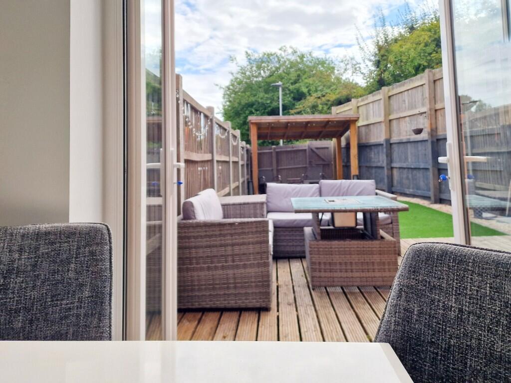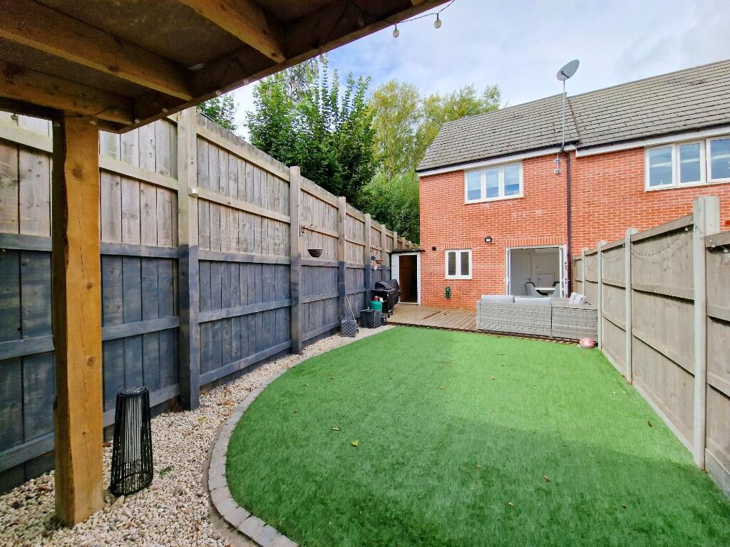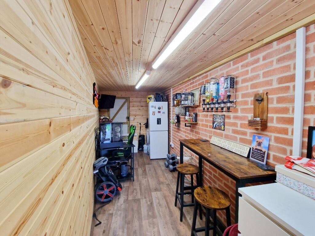 Rear Garden:- - Commencing with a decked area the garden extending across artificial lawn to a covered seating area to the rear. To the side an outbuilding is currently used as a home bar. Gated rear access leads to allocated parking.