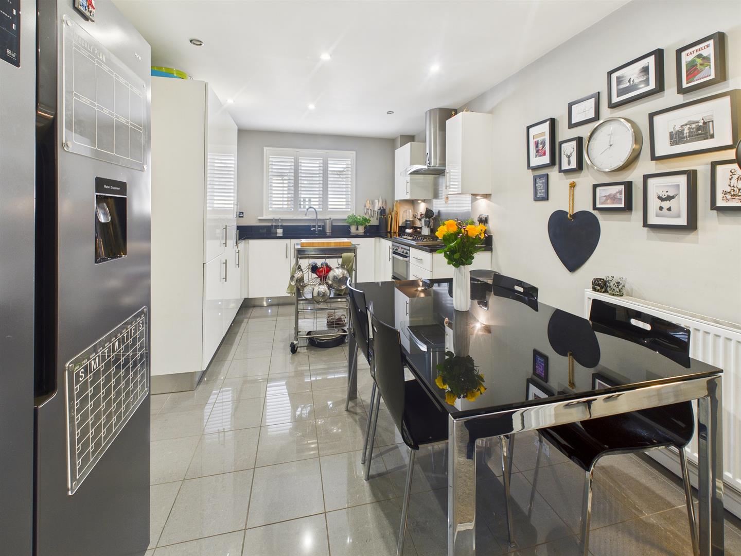 Dining/Kitchen - 4.52m x 2.90m (14'10" x 9'6") - Fitted with an excellent quality range of base and eye level units and working surfaces and granite working surfaces, incorportaing a one and a half bowl stainless steel sink unit with granite splashbacks. With stainless steel five ring gas hob with with top oven/grill and main oven below. Extractor over. Space for American-style fridge/freezer and integrated AEG dishwasher. With tiled flooring, double radiator and uPVC sealed unit double glazed window to front. With double doors leading through into the lounge.