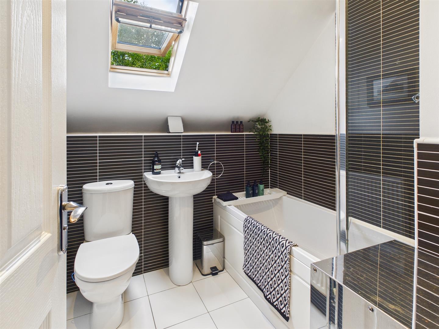 Bathroom - 2.01m x 1.91m (6'7" x 6'3") - Fitted with an excellent quality suite, comprising of panelled bath with shower over and shower screen, low-level suite W.C., and pedestal wash basin. With Velux sealed unit double glazed loft window, single radiator, extractor fan and half tiled throughout.