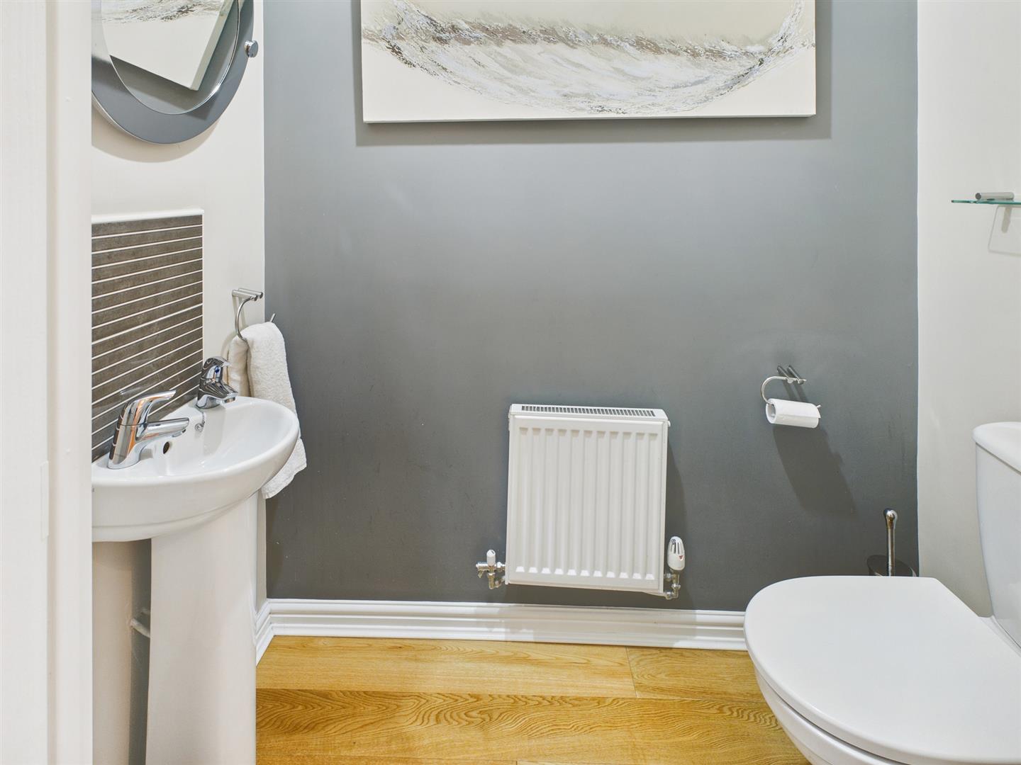 Cloakroom - 1.73m x 0.97m (5'8" x 3'2") - With a low level suite W.C., pedestal wash hand basin and extractor fan. Single radiator. Oak engineering flooring.