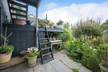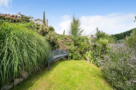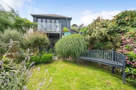Outside - The gently tiered garden offers a charming cottage feel, with mature plants and winding paths leading from a sun deck boasting stunning sea views. Perfect for relaxing or entertaining, this outdoor space is full of character and designed to make the most of its coastal setting.