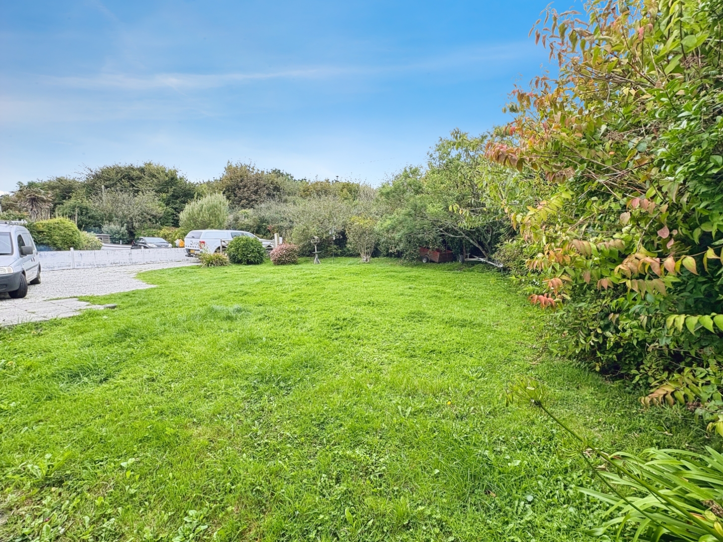 Outside - To the front, there is a lawned area and a graveled driveway providing off-road parking. To the rear, the garden is currently split into two sections, one used by the cabin and the other as the main garden for the house, offering flexibility for various uses.