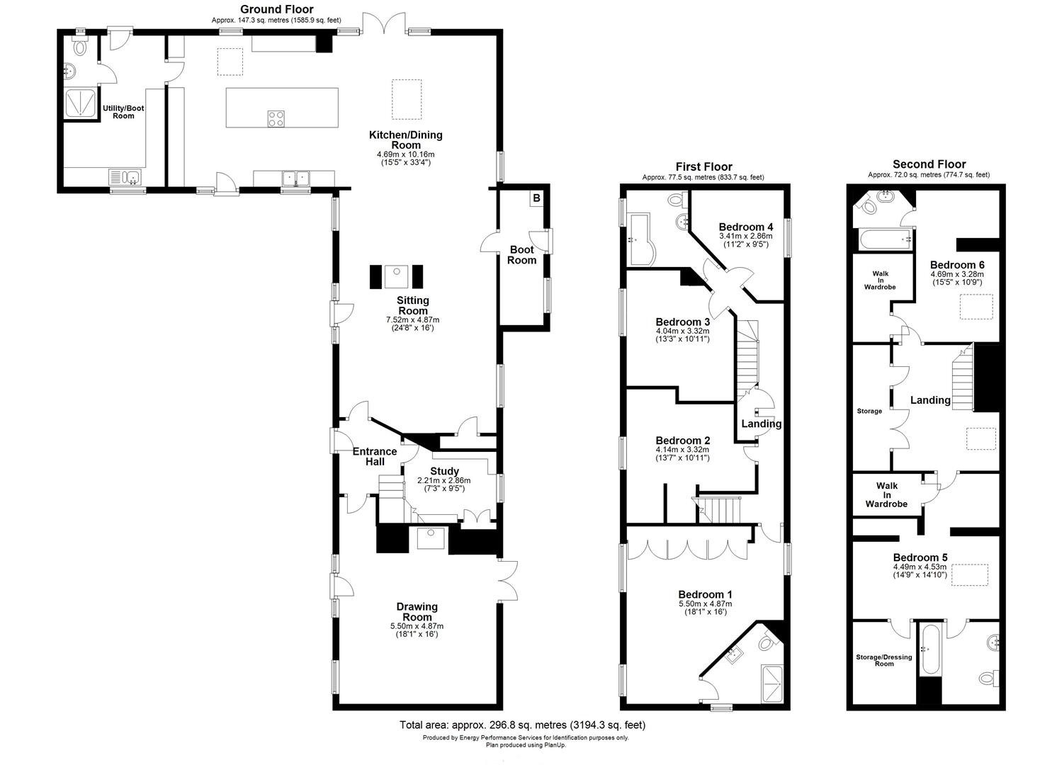The accommodation benefits from oil fired central heating and timber framed double glazing. From the gravel parking area, at the front of the converted barn timber part glazed door opens to: Entrance Hall, Drawing Room; a double aspect room, windows and door to the front and French doors to the rear, feature stone and granite fireplace and woodburning stove, beamed ceiling, study with built in desk units, fitted cupboard and window to rear. Sitting Room; A dual aspect room with window to the rear and window and door to the front, double sided woodburner, opening to; Kitchen / Dining Room; A dual aspect room with windows to the front and rear and French doors opening onto the patio Karndean flooring throughout into the Entrance Hall. Fitted wall and base units with matching central island under slate worksurfaces, twin stainless steel sink with Quooker tap for instant boiling water, Neff induction hob and gas wok burner, two built in Neff electric ovens, combination oven / microwave and warming draw. A bright light and airy room, vaulted ceilings and exposed 'A' frames. Rear Entrance / Boot Room; Worcester oil fired boiler, stable door to the rear. Utility / Boot Room; Fitted base units, 1 ? bowl sink and draining board, a dual aspect room with window the front and door to the rear, vaulted ceiling exposed 'A' frames, space for fridge, freezer, washing machine and tumble dryer. Shower Room; Wash basin, W/C, and shower enclosure. On the First Floor; Large landing with windows to the rear overlooking the garden and land. Master Bedroom; A dual aspect room with windows to the front and rear, fitted wardrobes. En suite Shower Room; Vanity unit wash hand basin, W/C and corner shower. Bedroom 2; A double room with window the front. Bedroom 3; A double room with window to the front. Bedroom 4; Window to the rear. On the second floor; Large landing, built in storage cupboards and Velux window to the rear overlooking the paddocks. Bedroom 5; Walk in wardrobe, Velux window to the rear. En suite Bathroom; Wash basin, W/C, bathroom with shower above. Bedroom 6; Velux window to the rear and separate walk in cupboard / storage. En suite Bathroom; Wash basin, w/c, bath with shower above.