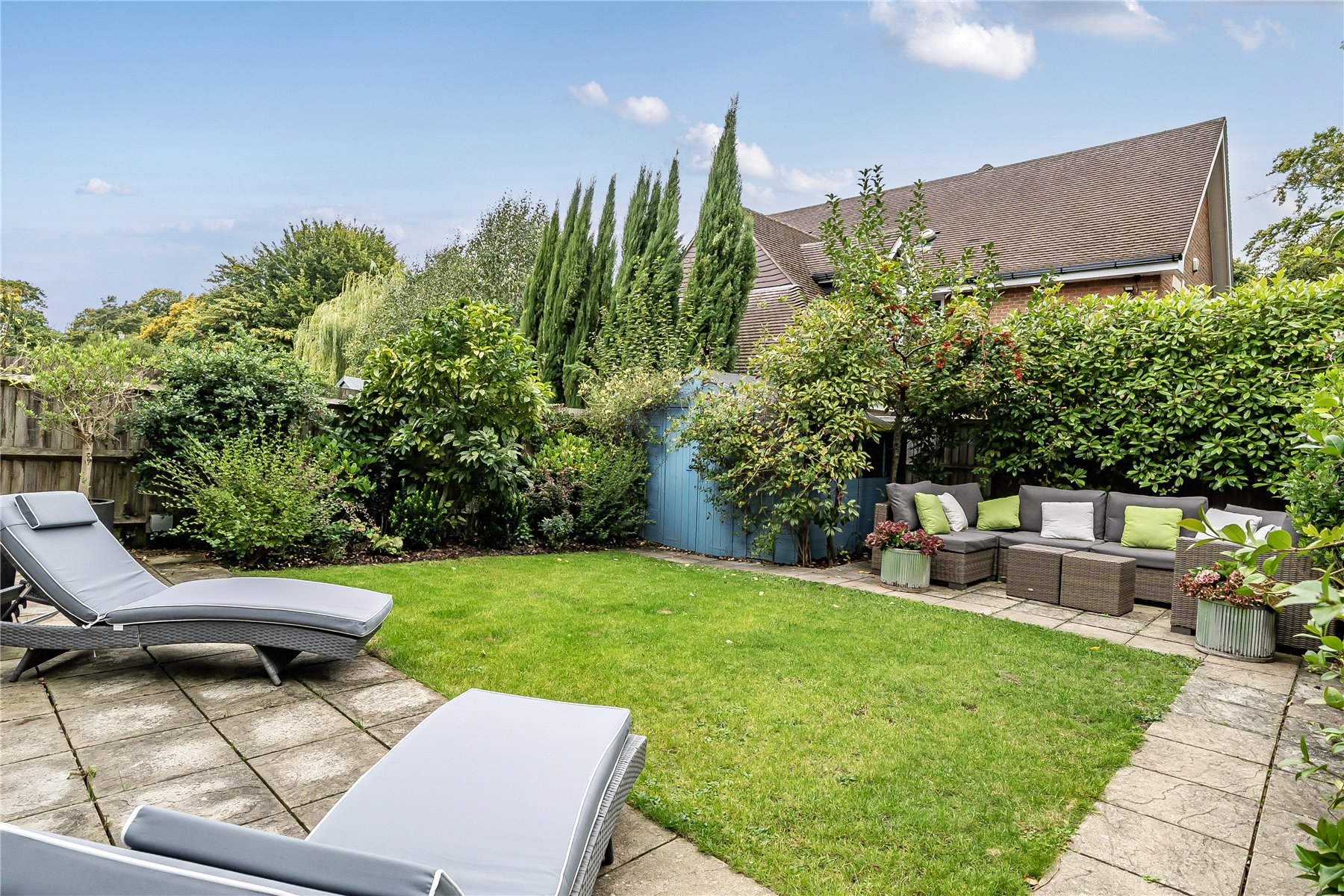 The private rear garden is perfect for outdoor entertaining and al fresco dining. Enclosed by mature hedging, the garden is mainly laid to lawn, with multiple areas in which to enjoy the summer months.