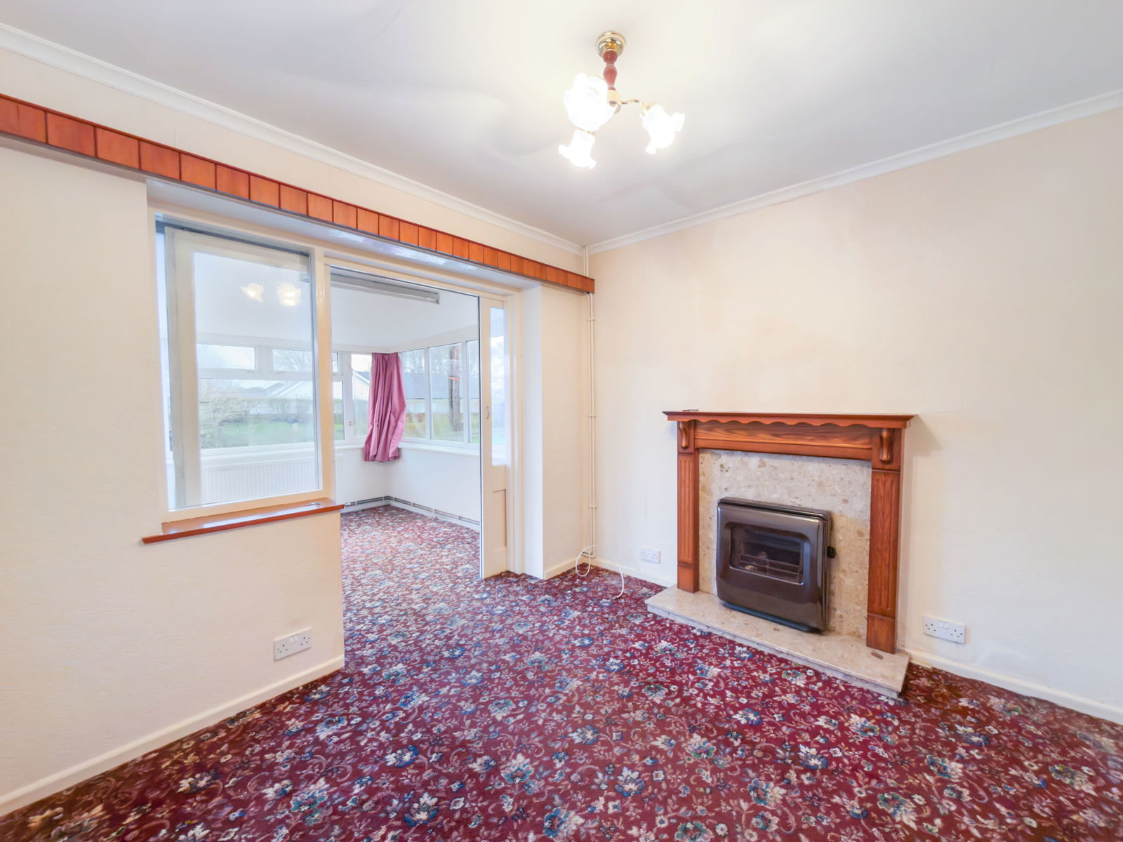 Radiator. Solid fuel Parkray fireplace with fire and mantel surround. Sliding doors opening onto