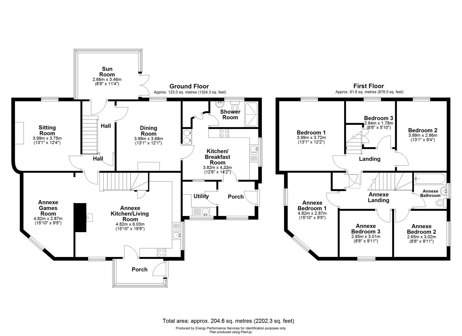 Entrance porch; tiled floor. Utility; tiled floor, fitted wall and base units, space and plumbing for washing machine. Kitchen / Dining Room; Fitted wall and base units under roll top worksurface, fitted electric double oven and hob with extractor above, Rayburn Nouvelle LPG range cooker with back boiler providing domestic hot water and central heating, built in airing cupboard; shower room; large shower cubicle, w/c, wash hand basin and heated towel rail. Dining Room; Feature cut stone fireplace, inset multi fuel fire, window to the front, views over the surrounding countryside. Inner Hall; staircase rises to the first floor. Sunroom; a triple aspect room with dwarf walls and uPVC double glazing with French doors opening onto the patio. Inner hall; door to the Annex. Sitting room; cut stone fireplace, woodburning stove, window the front overlooking the land. On the first floor: Landing; connecting door to the annexe and doors off to; Bedroom 1; Exposed beams, windows overlooking the land. Bedroom 3; Fitted wardrobes, window over looking the land. Bedroom 2; Exposed ceiling beams, window with views over the land.