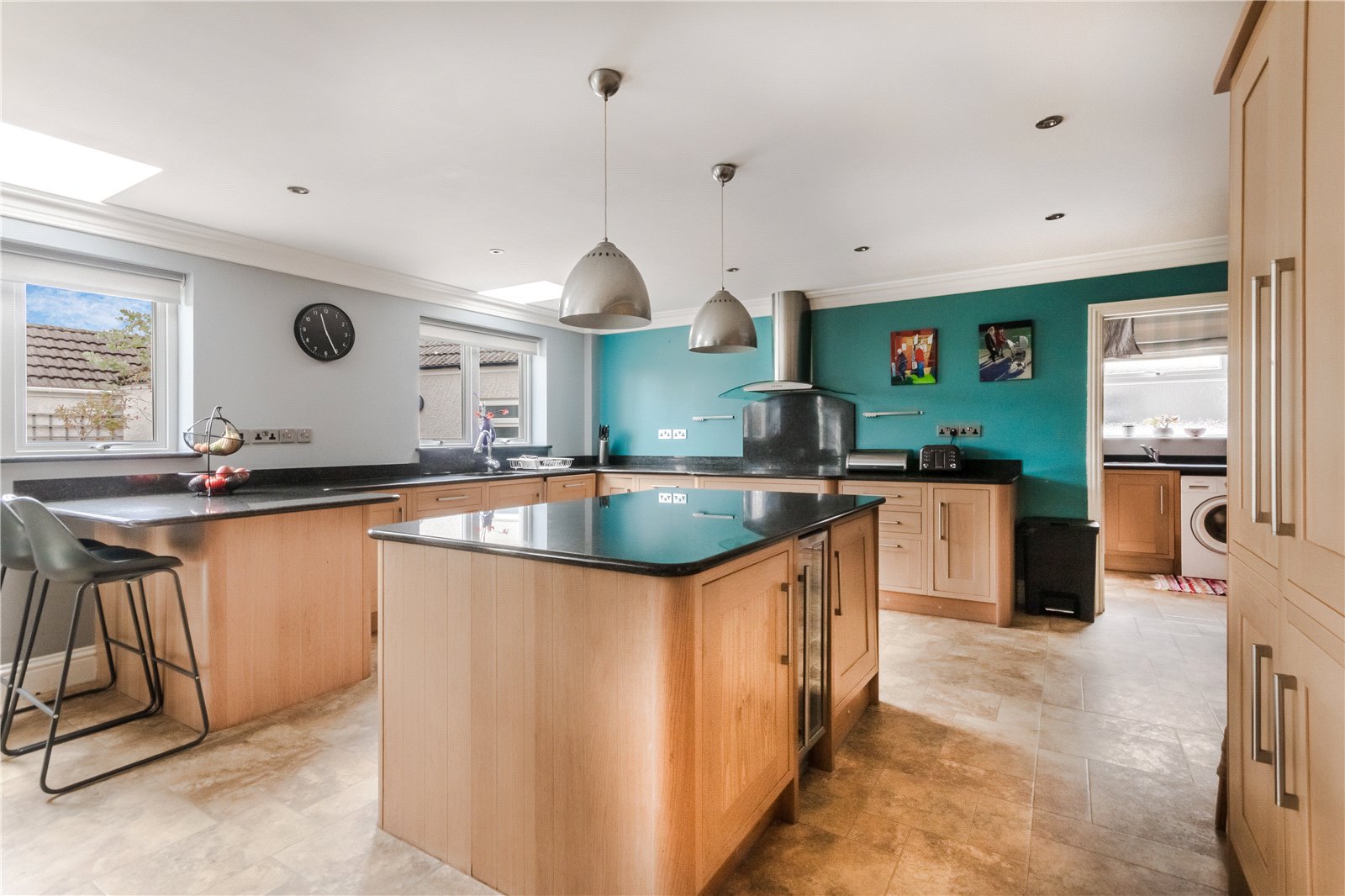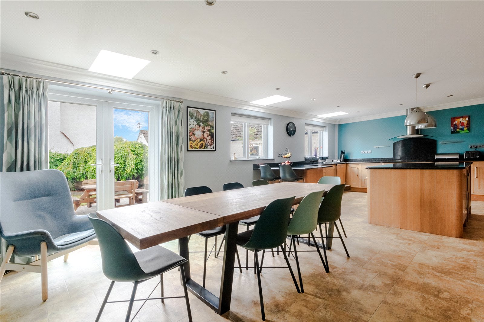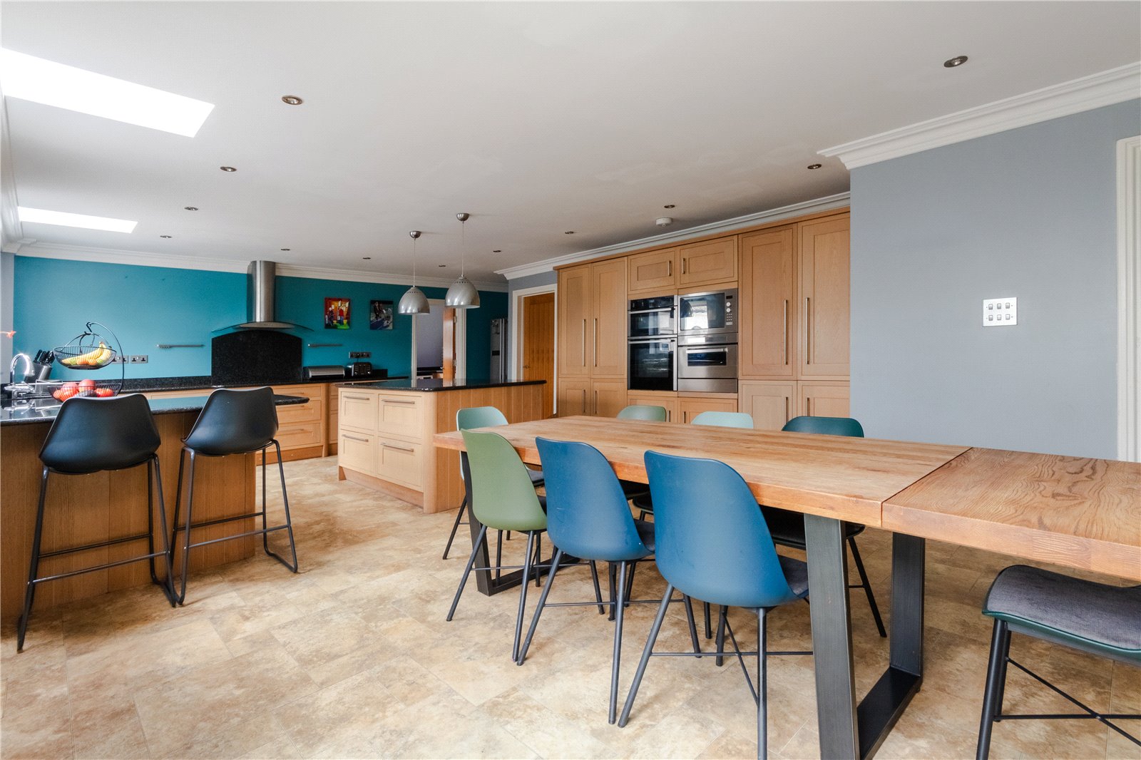 Kitchen/Family Room 27'9" (8.46m) x 20'3" (6.17m) Of exceptional proportions with a range of quality units along three sides beneath granite worktop surfaces, inset 1.5 bowl stainless steel sink with mixer tap and drainer, inset four ring Neff hob with circulating fan above, wealth of base store cupboards housing integrated dishwasher with matching front, central island with drawers and wine cooler, integrated Hotpoint oven with warming tray, integrated Hotpoint microwave, integrated Neff oven with separate grill, retractable larder unit, under counter freezer, quality flooring, skirting board lighting, ceiling spotlighting, ample space for large breakfasting table, double glazed French doors leading to the rear garden.