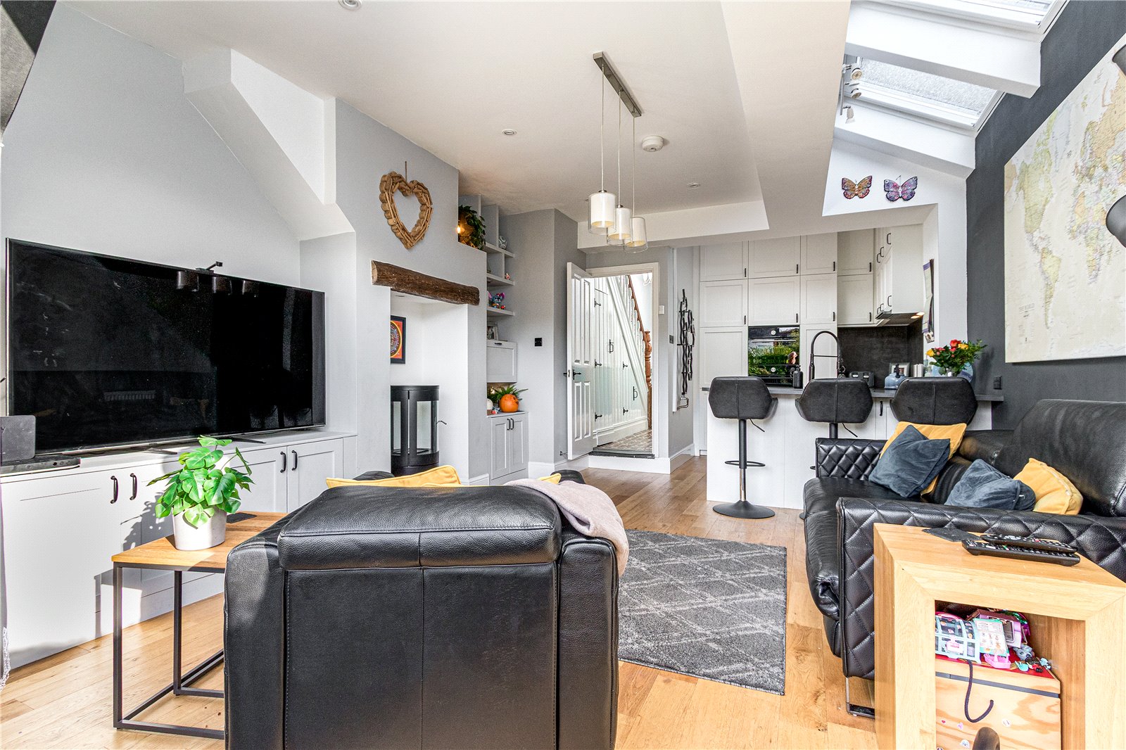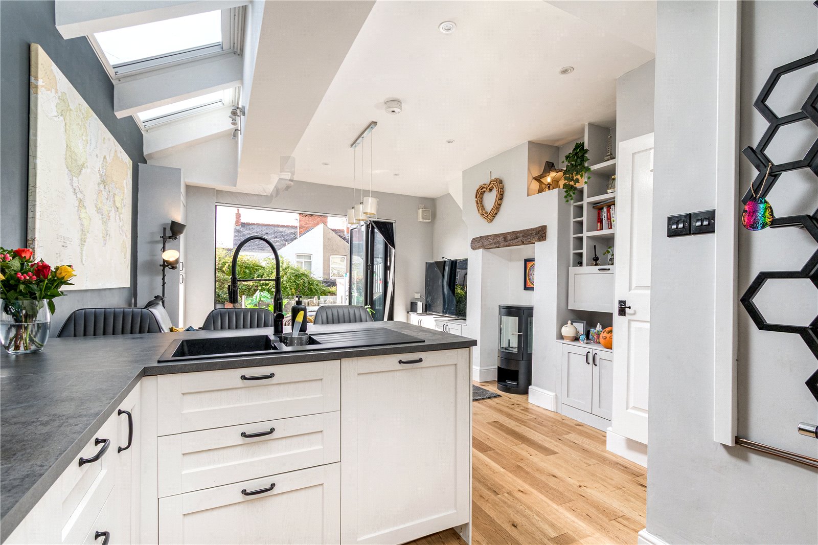 rear garden, bi-folding doors, feature recess fireplace with mantel, bespoke