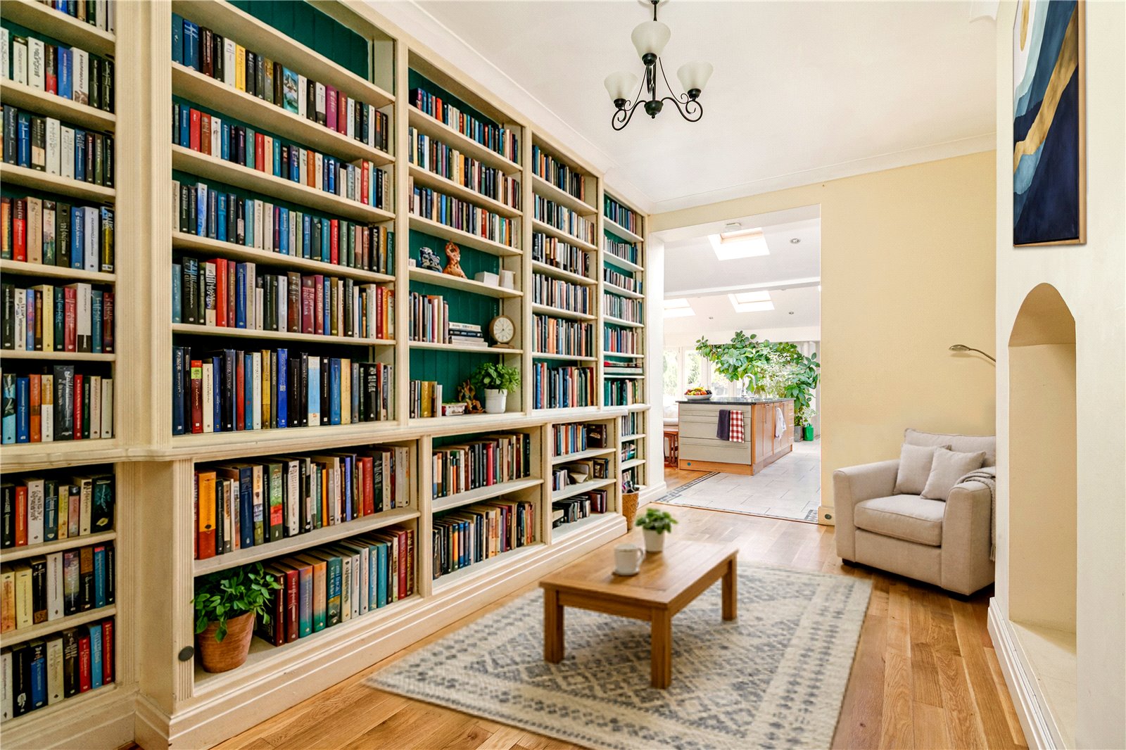 Sitting/Library Room 16'0" (4.88m) x 9'7" (2.92m) With a range of bespoke book shelving to one complete side, matching shelving to chimney breast recess, radiator, oak strip flooring.