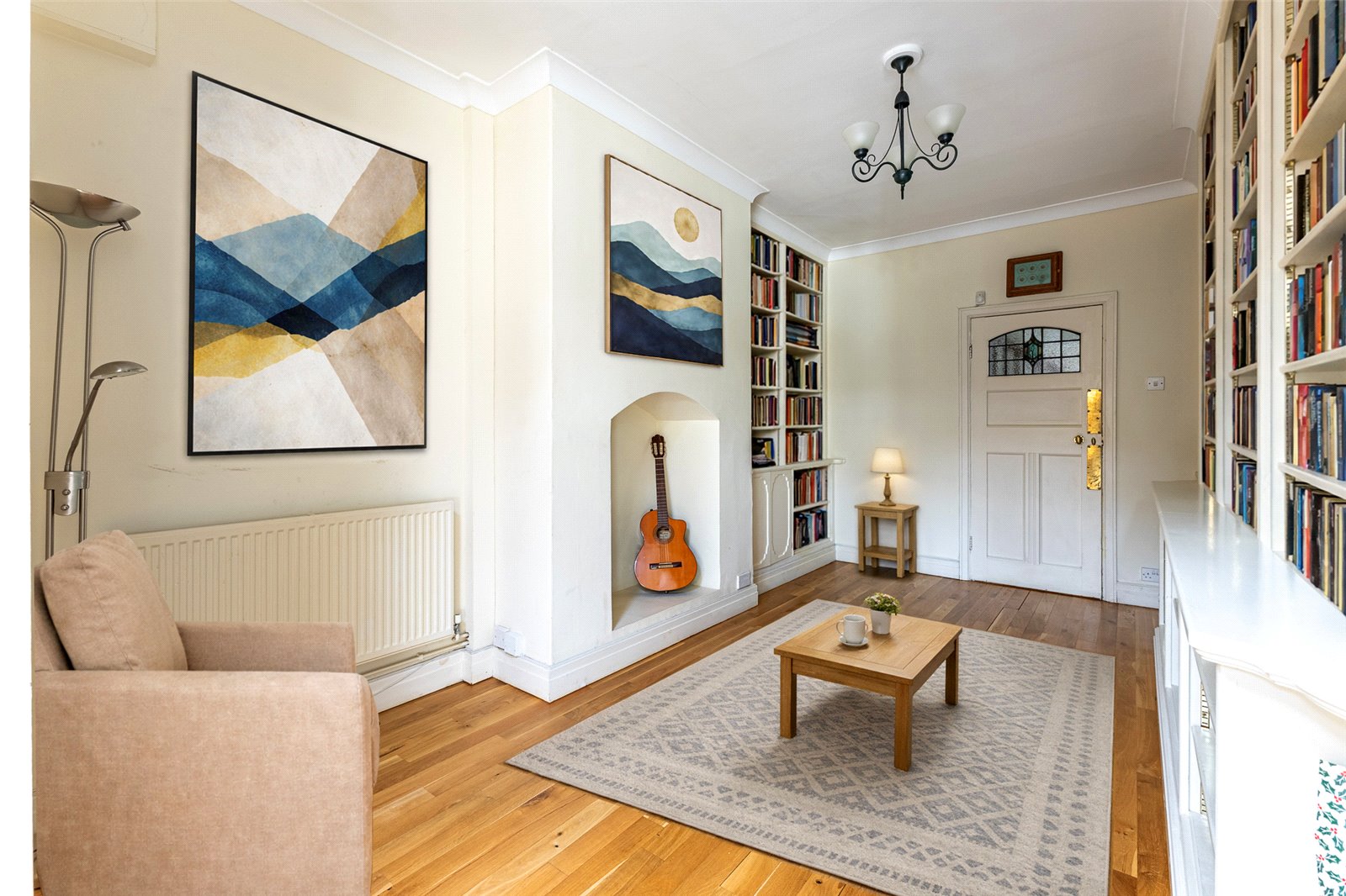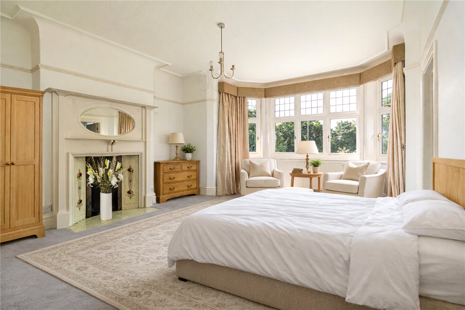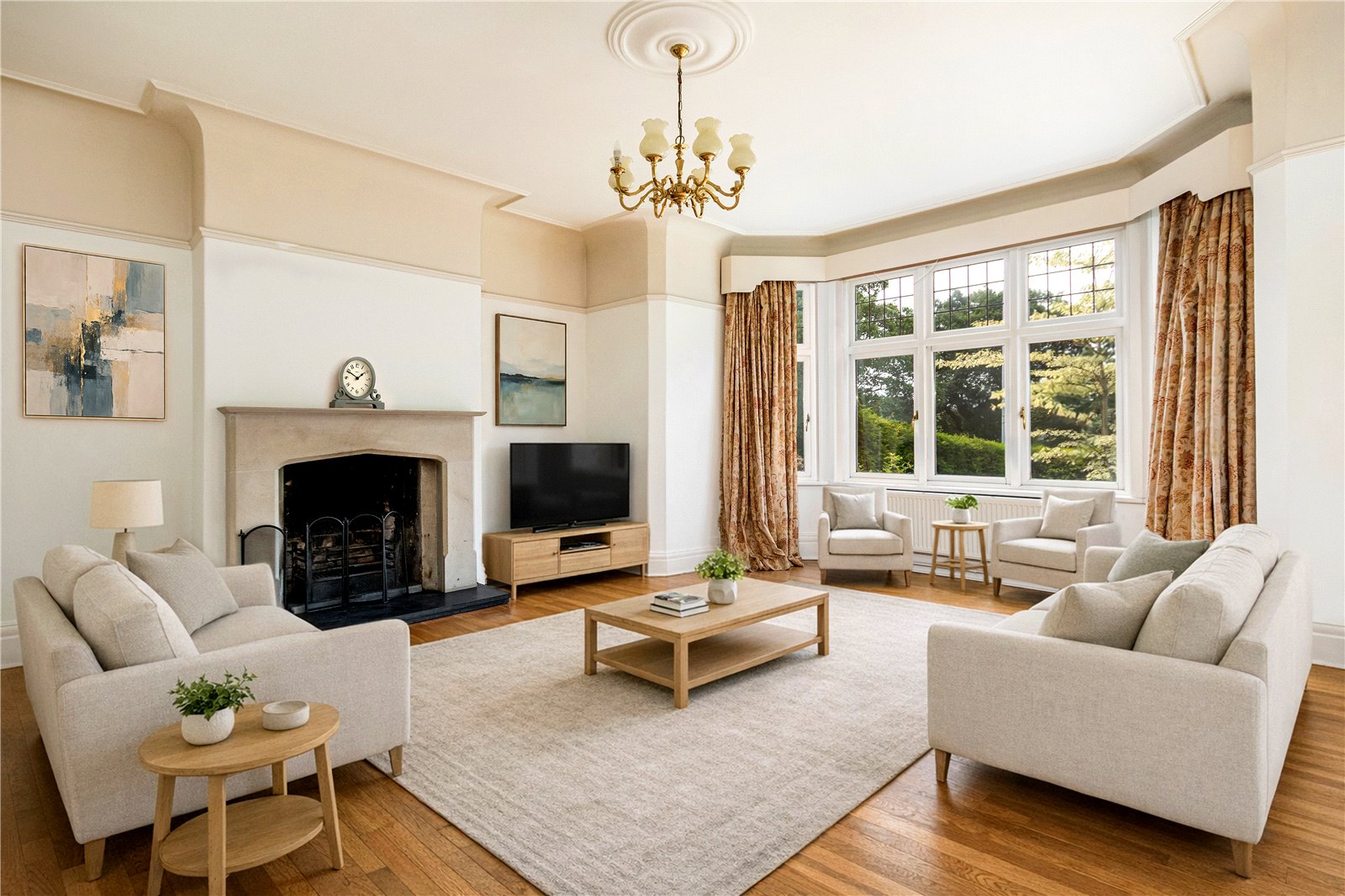 Lounge 17'9" (5.41m) x 16'0" (4.88m) into bay With deep bay overlooking the entrance approach with replacement double glazed windows and leaded light fanlights, overlooking the front garden and tree lined park to the fore, Minster stone fire surround with mantel and slate hearth, decorative corniced ceiling, oak strip flooring.