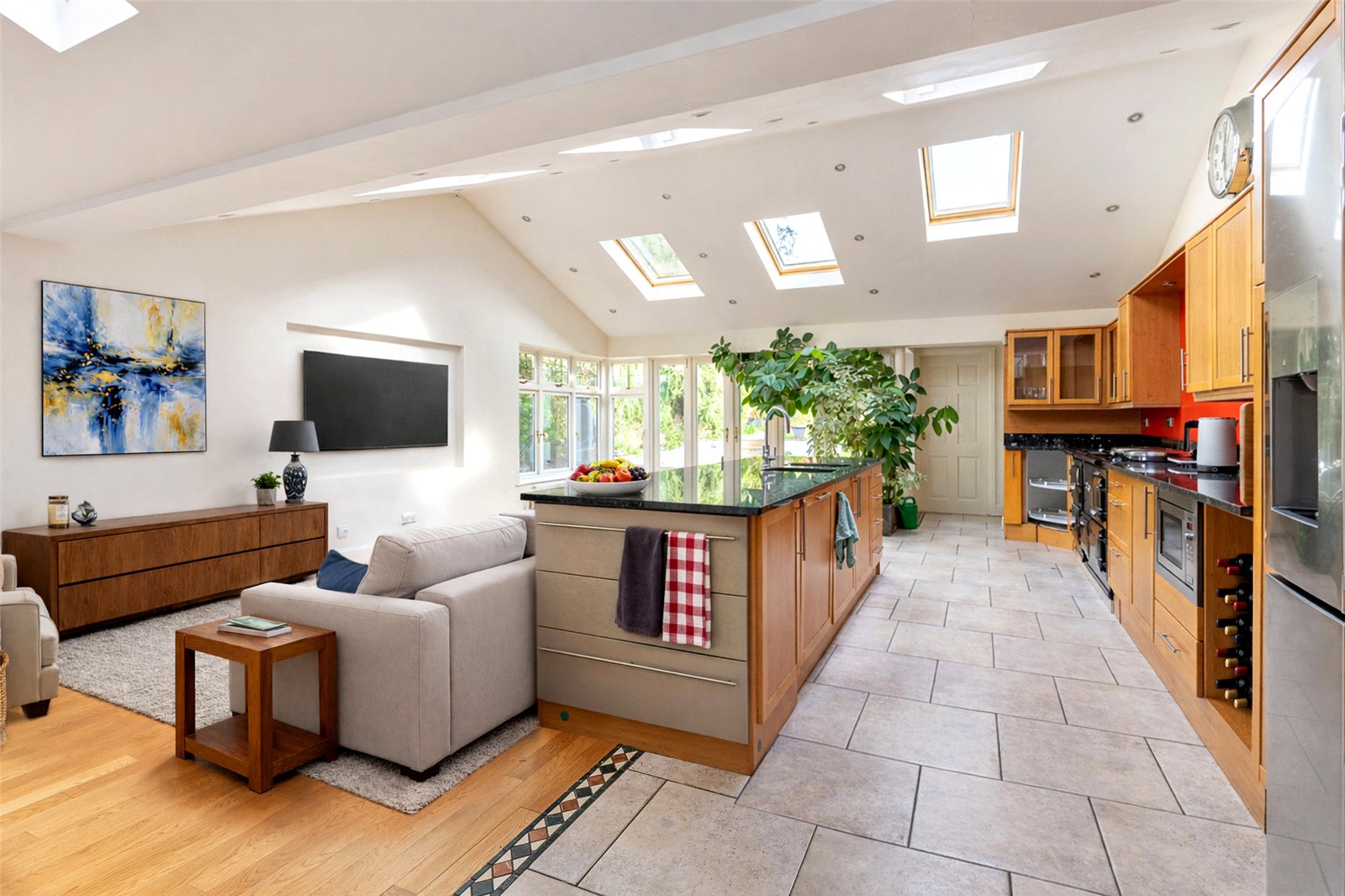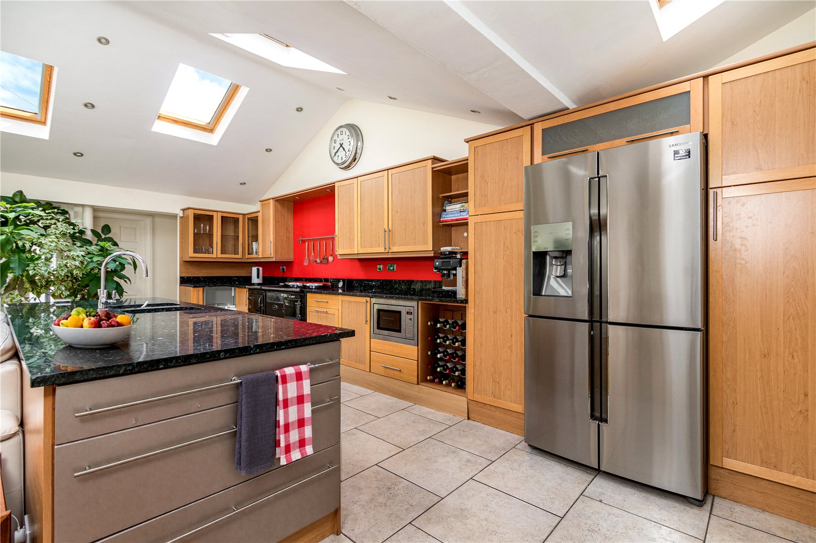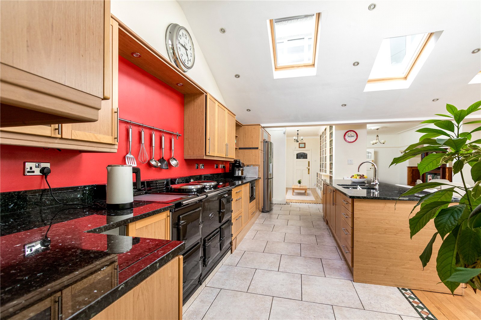 Kitchen/Family Room 22'10" (6.96m) x 20'3" (6.17m) Magnificent fitted kitchen/family room with a range of natural wood units beneath granite worktop surfaces, central granite island inset Franke twin stainless steel bowls and mixer tap, integrated Neff dishwasher with matching front, wealth of base and eye level cupboards with pelmets and borders, Aga Range style gas cooker with twin hotplates and warming plate, ovens below, integrated Bosch microwave, retractable larder unit, vaulted ceiling with spotlighting, Velux windows, double panelled radiator, tiled flooring. Bright family area with bi-folding doors leading onto the attractive stone patio and lawned rear garden, double panelled radiator.