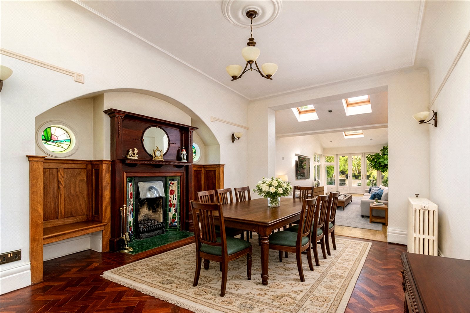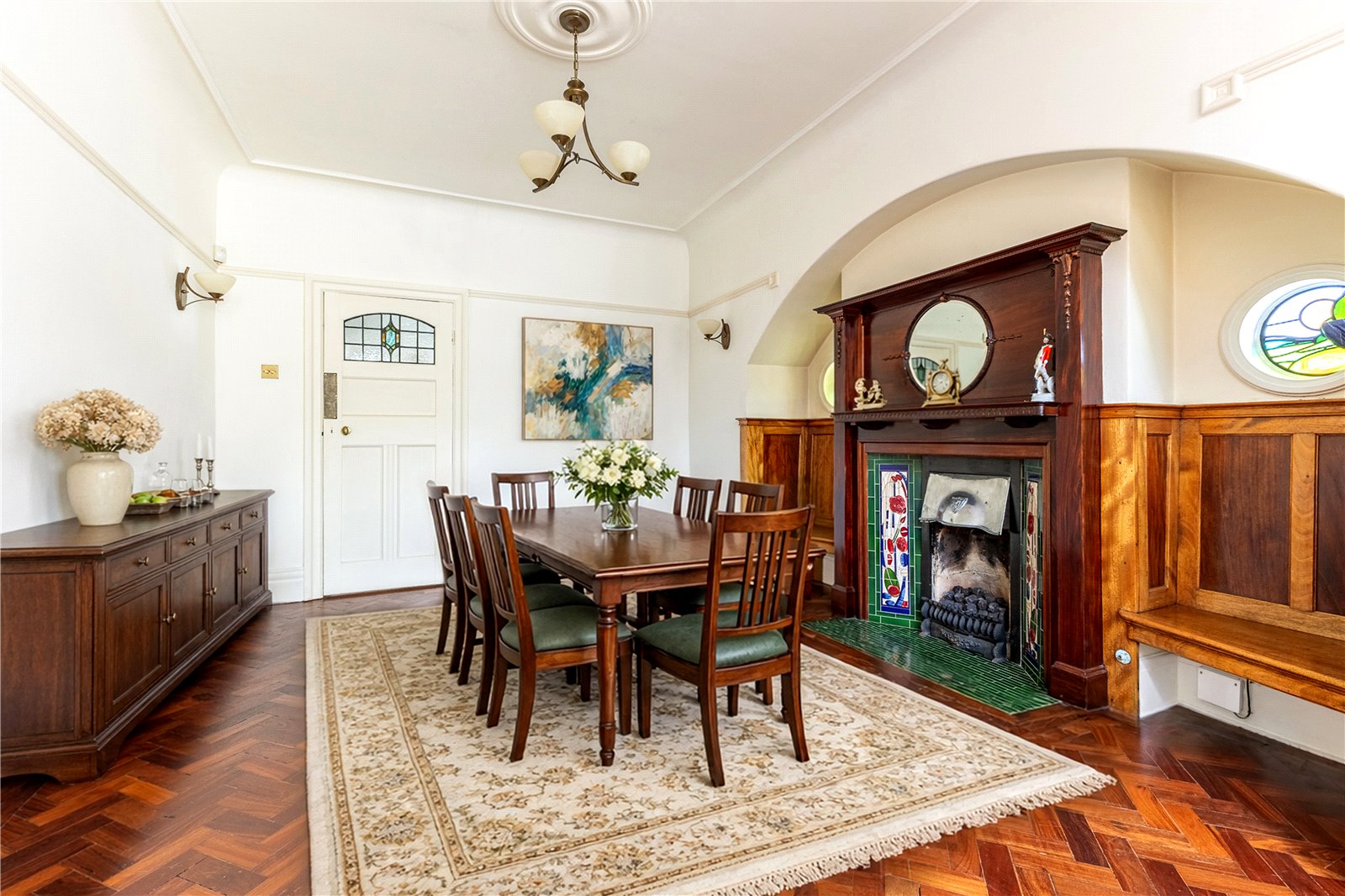 Dining Room 15'11" (4.85m) x 12'7" (3.84m) Ornate fire surround with circular mirror insert, raised mantel, decorative tiled hearth and reveals, gas point, feature snug style benches to either side of fire place with circular coloured leaded light windows, picture rail, hardwood flooring, tubular radiator, opening to kitchen/family room.