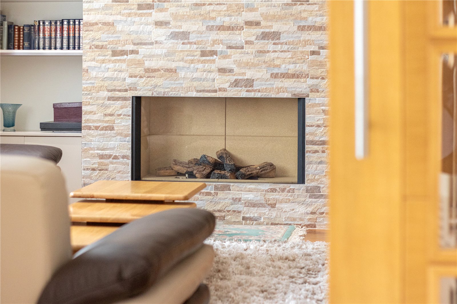 Sitting Room 17'10" (5.44m) x 11'8" (3.56m Approached by sliding oak panelled doors with bevelled glass inserts, leading onto a bright sitting room overlooking the entrance approach, feature Gasco log effect gas fire with stone finish tiled chimney breast, bespoke side display shelving and base cupboard, hardwood flooring, concealed lighting.