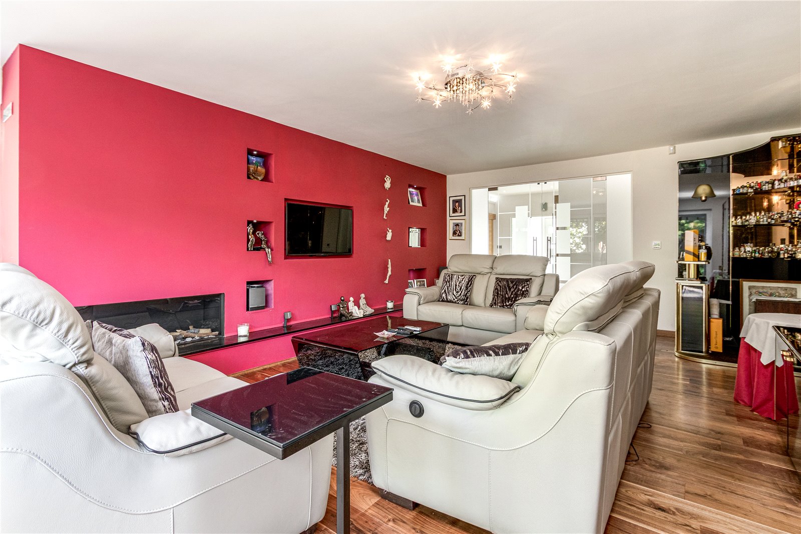 Lounge 21'2" (6.45m) x 16'2" (4.93m) Approached by rimless, soft close decorative glazed doors leading onto a spacious and bright main lounge with bi-folding doors leading to the sunny rear garden, integral window blinds with magnetic controls, feature Faber log effect gas fire, bespoke TV console with display shelf niches and matching display surfaces, quality engineered wood flooring, concealed lighting.