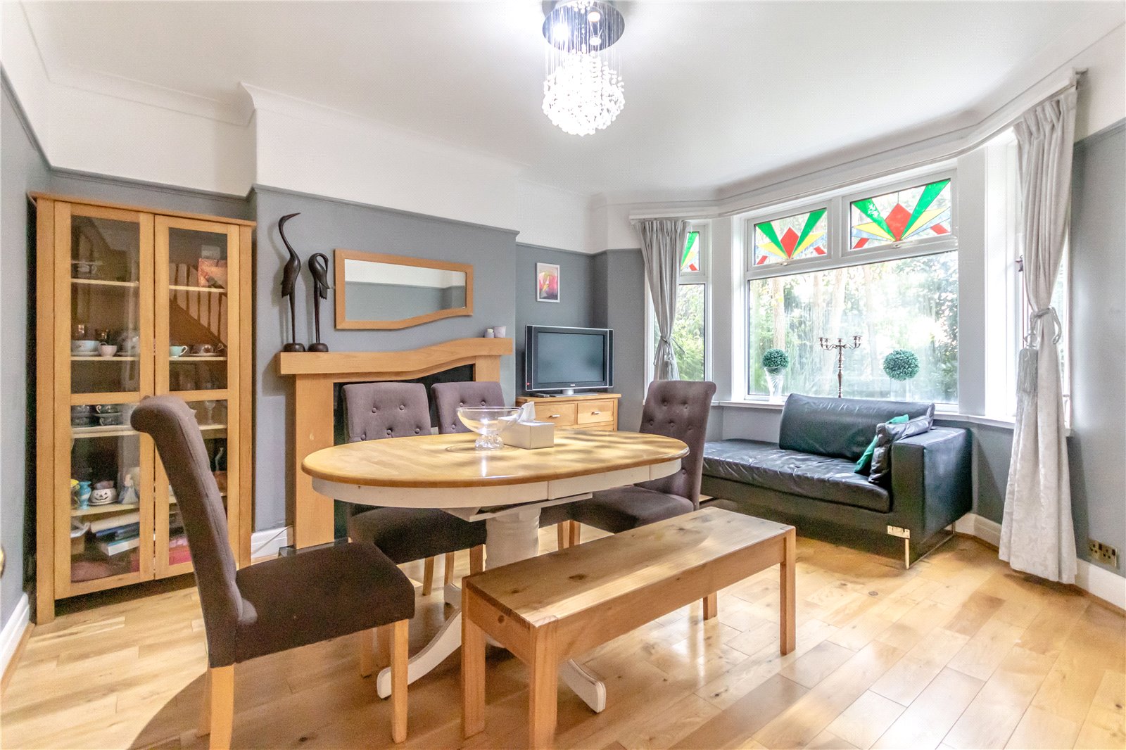 Dining Room 14'2" (4.32m) x 11'11" (3.63m) into bay Bay window overlooking the front garden, modern feature fire surround with coal effect gas fire and matching back and hearth, continuation of the oak engineered wood flooring, ample space for large family dining table, radiator.
