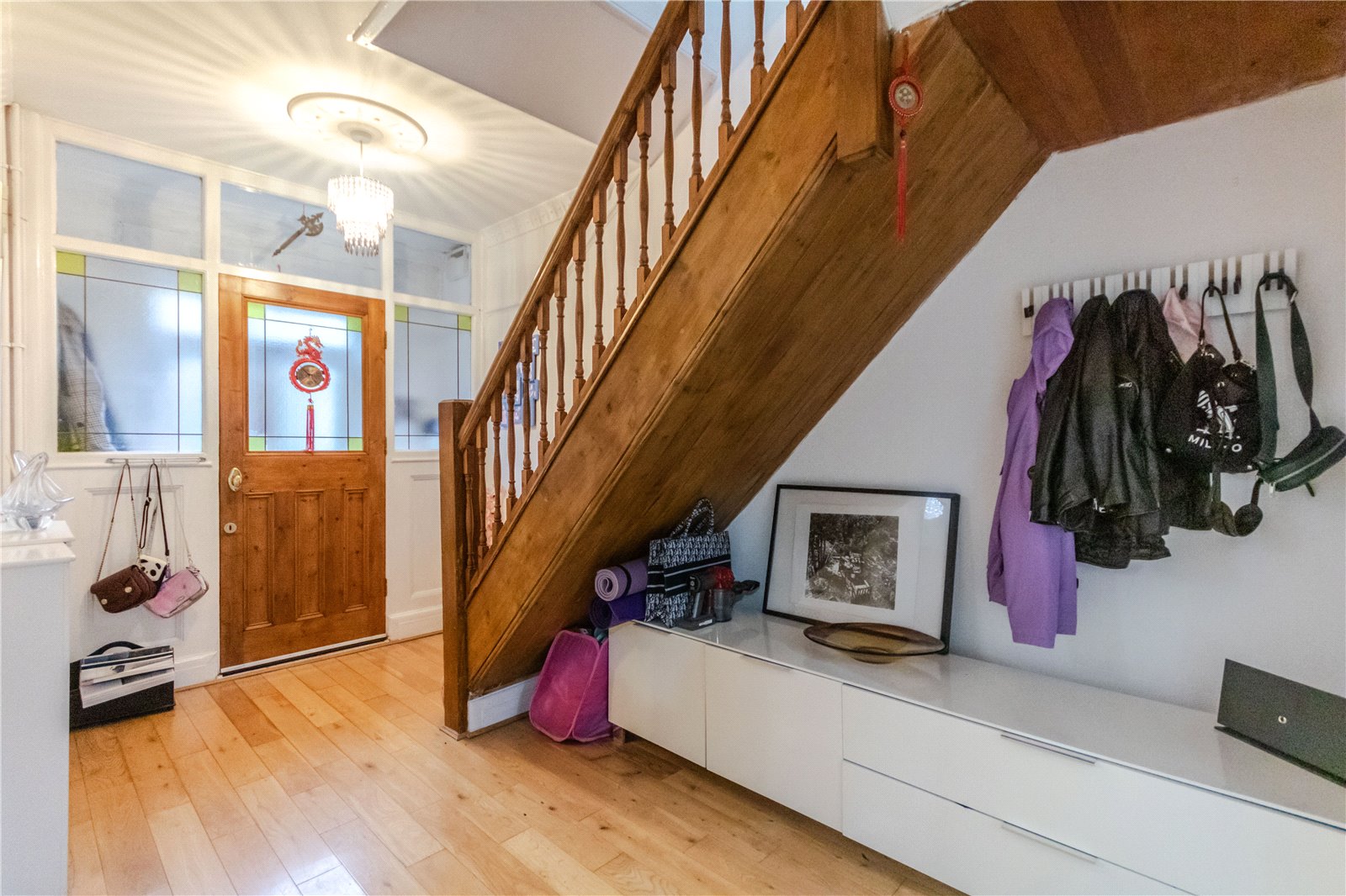 Entrance Hall Approached by a timber framed entrance door with colour leaded inset to upper part, matching glazed side panels, leading onto a central hallway with spindle staircase to first floor, oak engineered flooring, radiator.