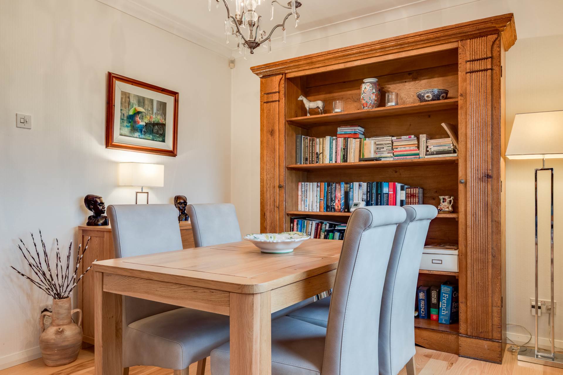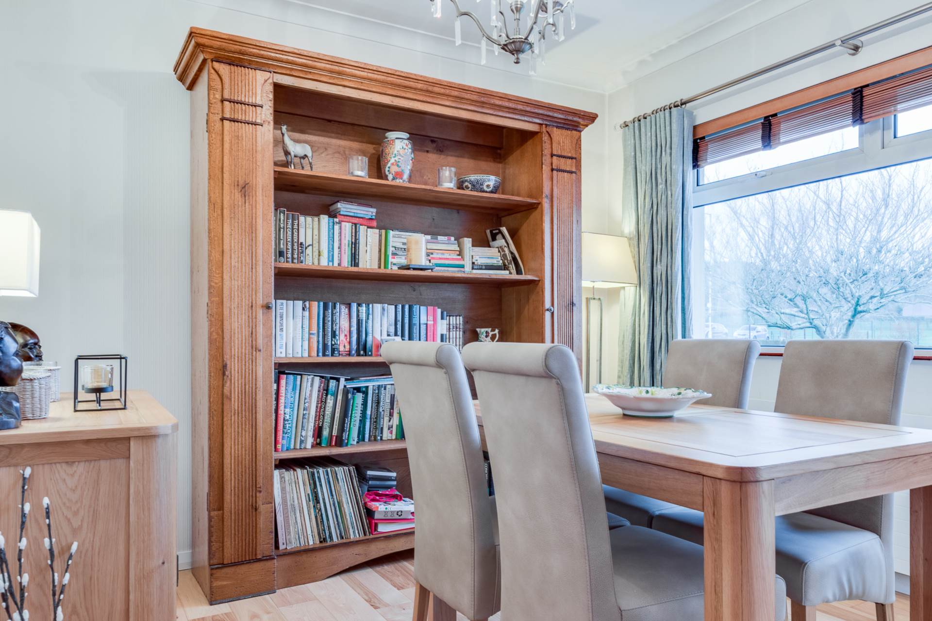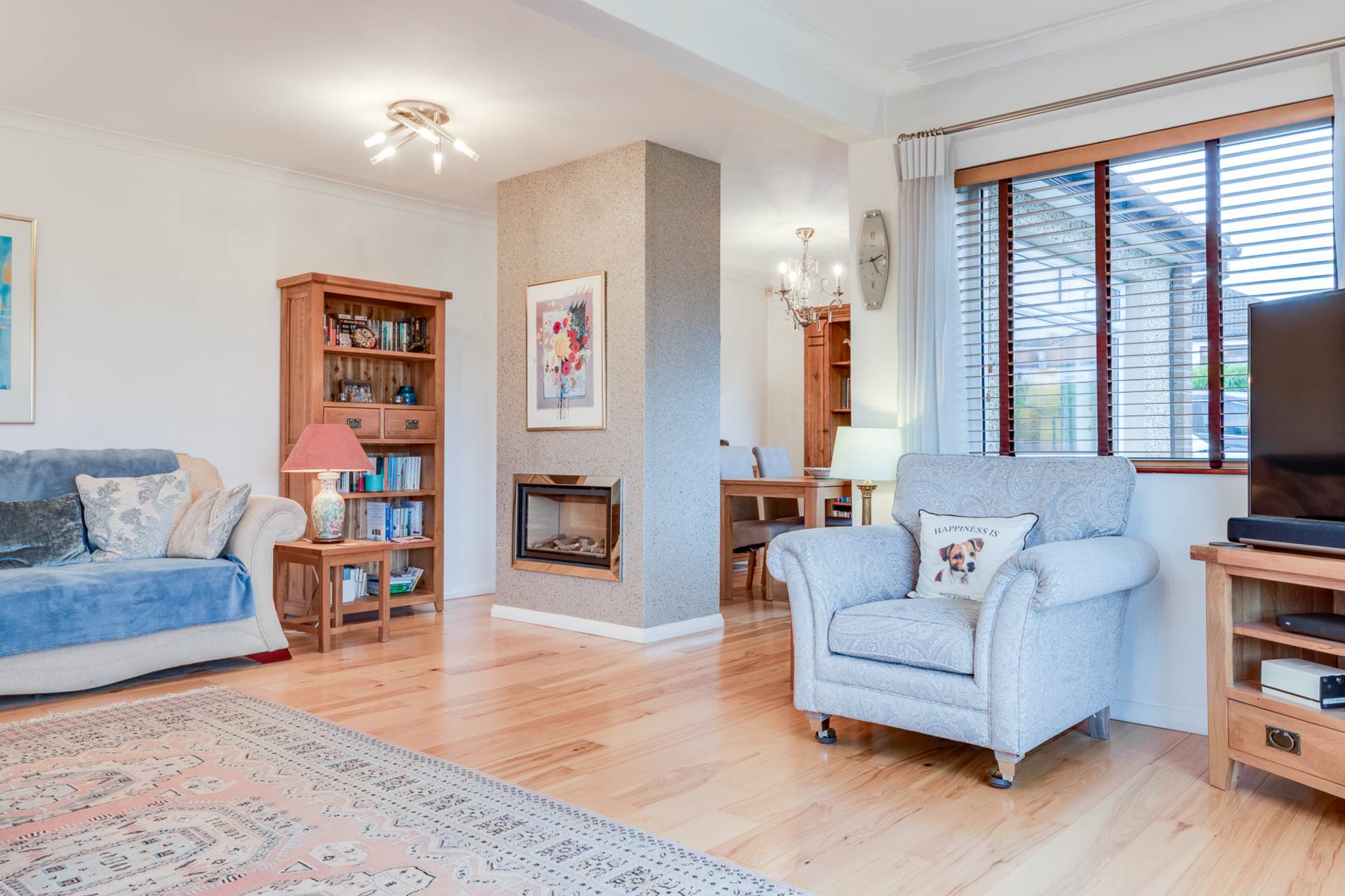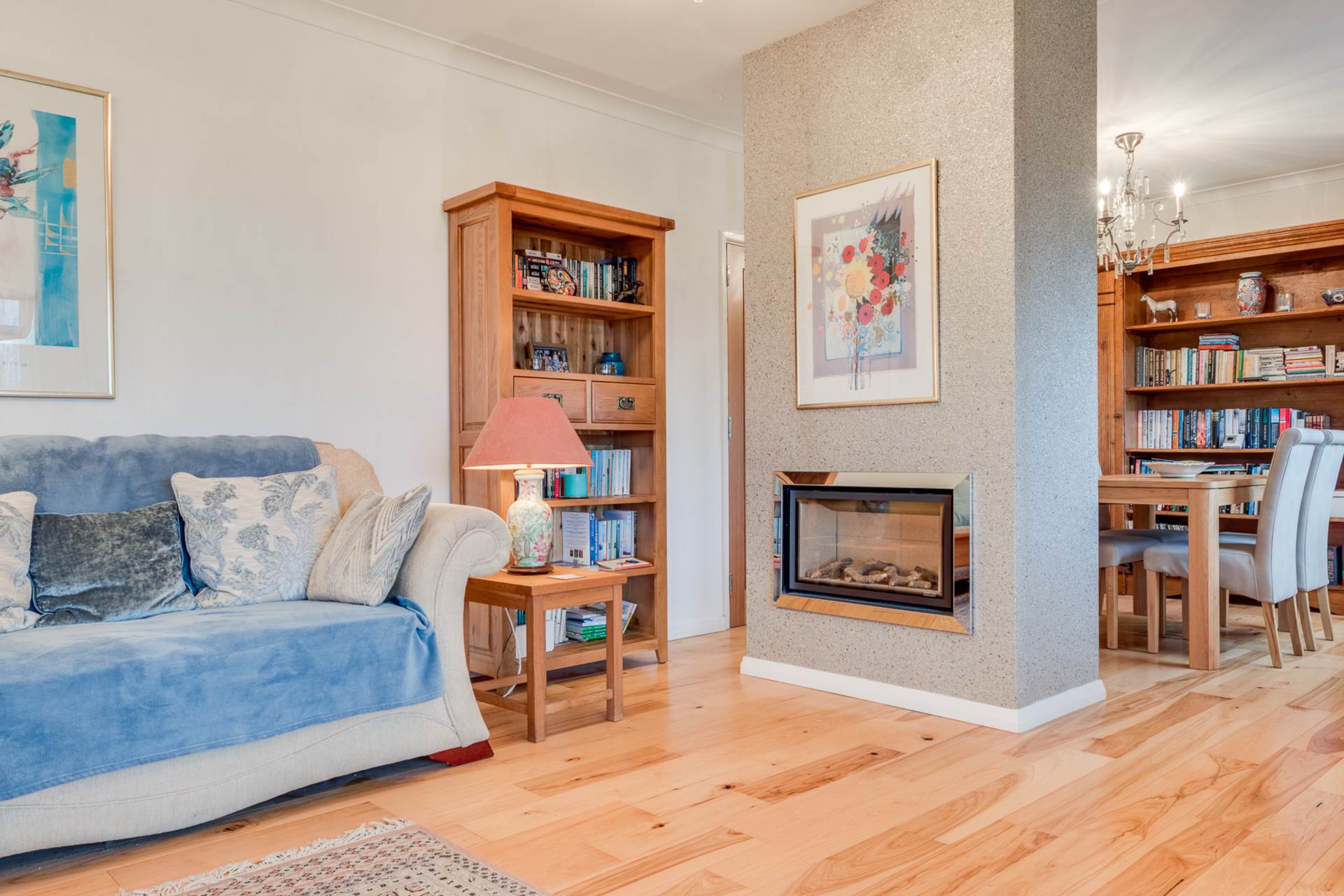 - Spacious open plan lounge/dining room with feature central fireplace and hickory wood flooring.