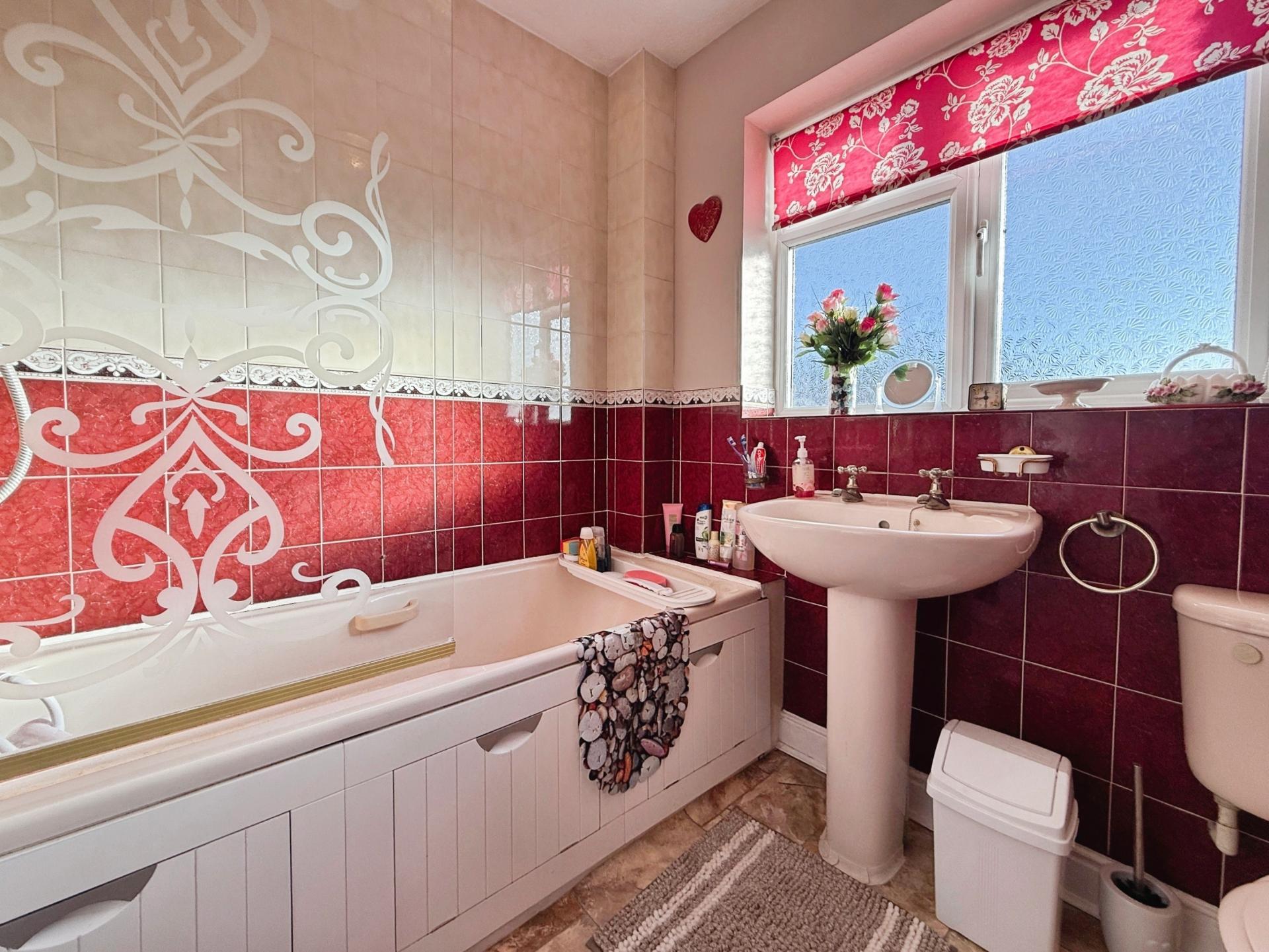 With ceiling light point, obscure uPVC double glazed window to rear elevation, part-tiled walls and three piece suite comprising panelled bath with shower over, pedestal wash hand basin and low flush wc.