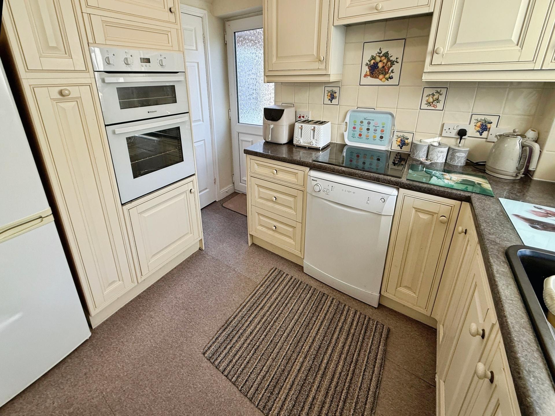 With useful pantry cupboard, uPVC window to rear elevation and door to side, space for free standing fridge/freezer and having a range of base and eye level Kitchen units with draw, cupboard and shelf space, worktop incorporating a one and a quarter sink and drainer with hot and cold mixer tap over, tiled splashbacks, inset hob, integrated oven and grill, recess and plumbing for washing machine and dishwasher.