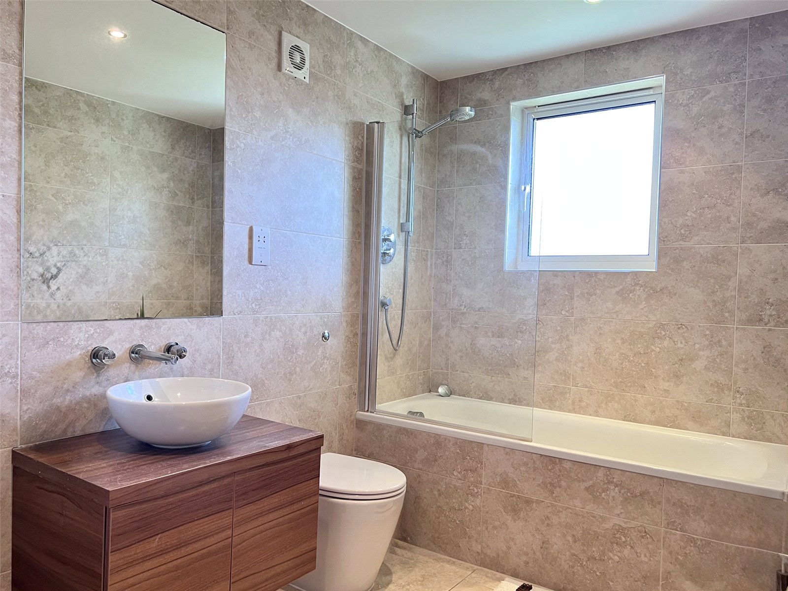 The stylish bathroom is finished in chic travertine-effect tiling, featuring a vanity unit with wash-hand basin, W.C., enamel bath with overhead shower, and a heated towel rail.