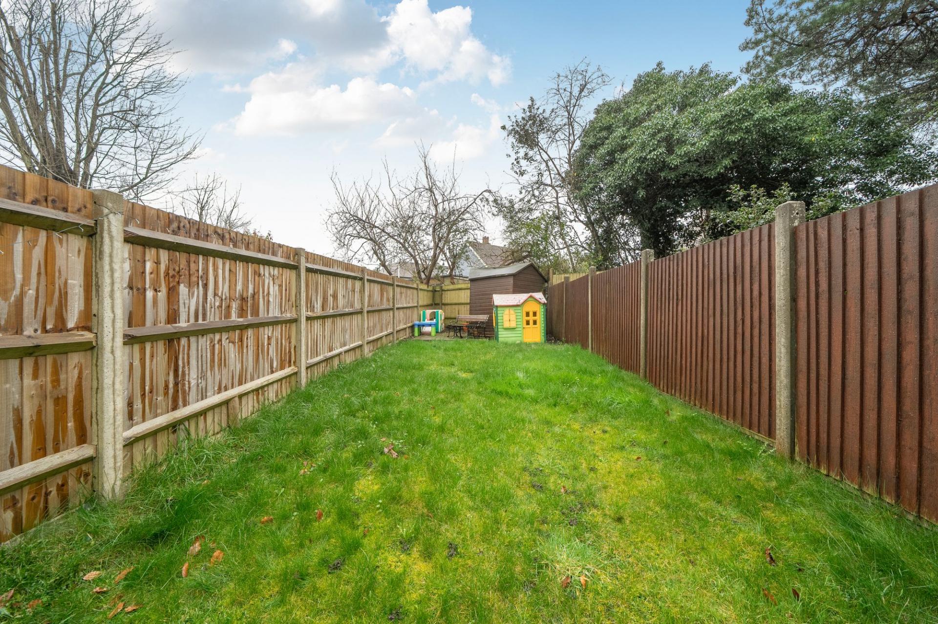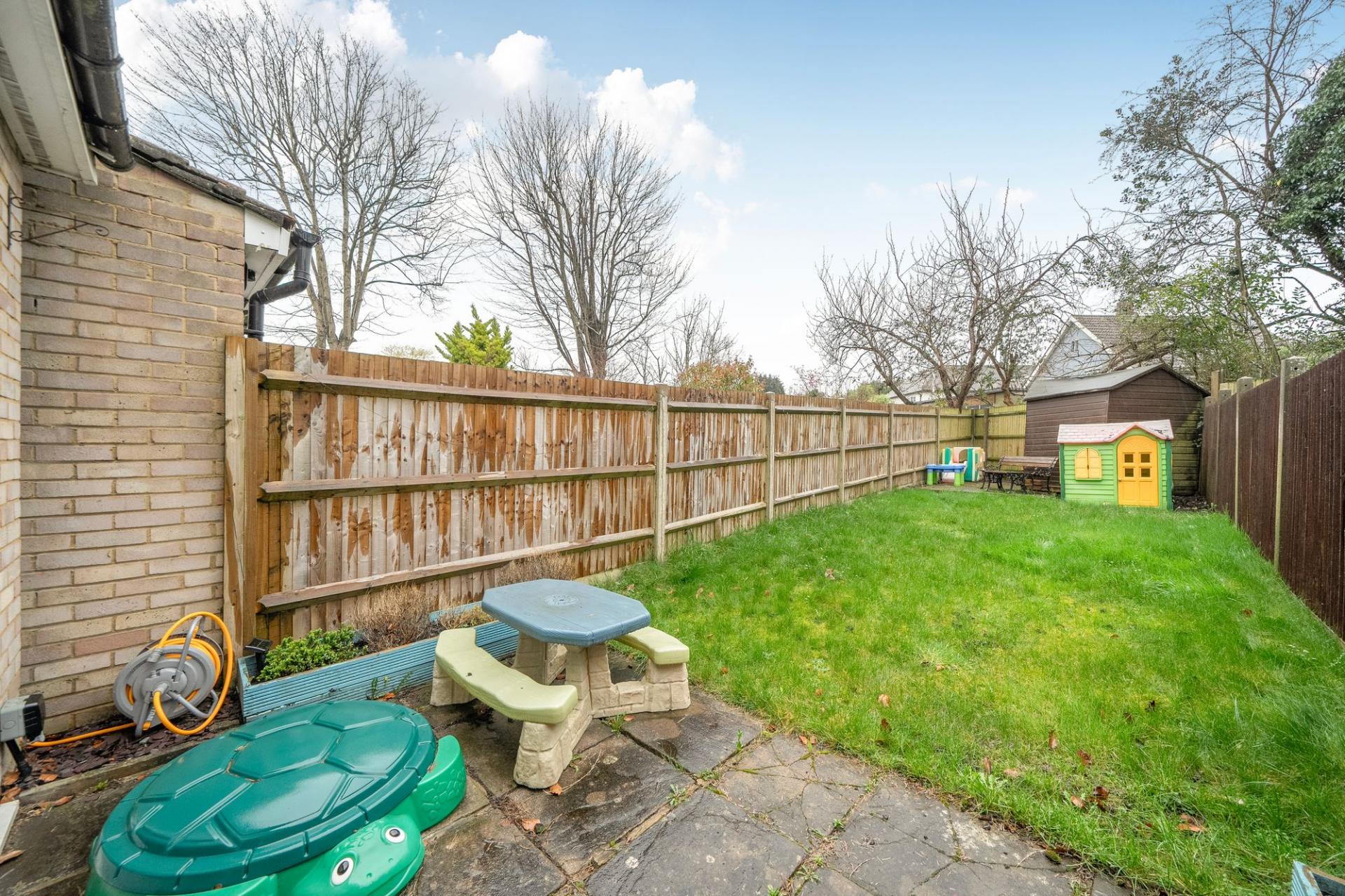 • Rear garden accessed through patio doors from the reception room, with patio, lawn and shed